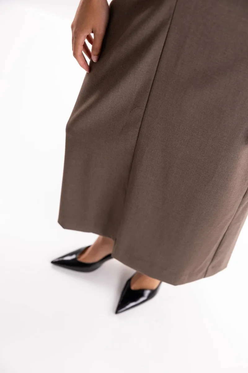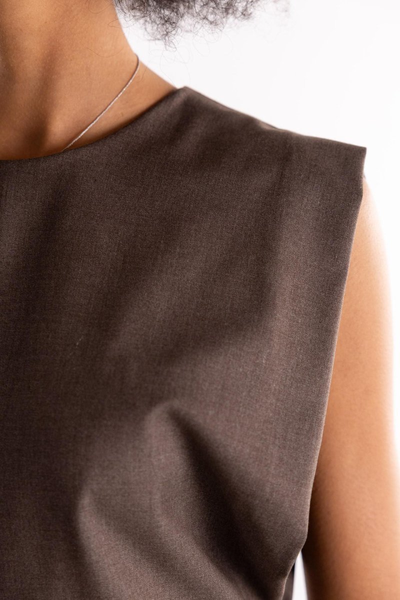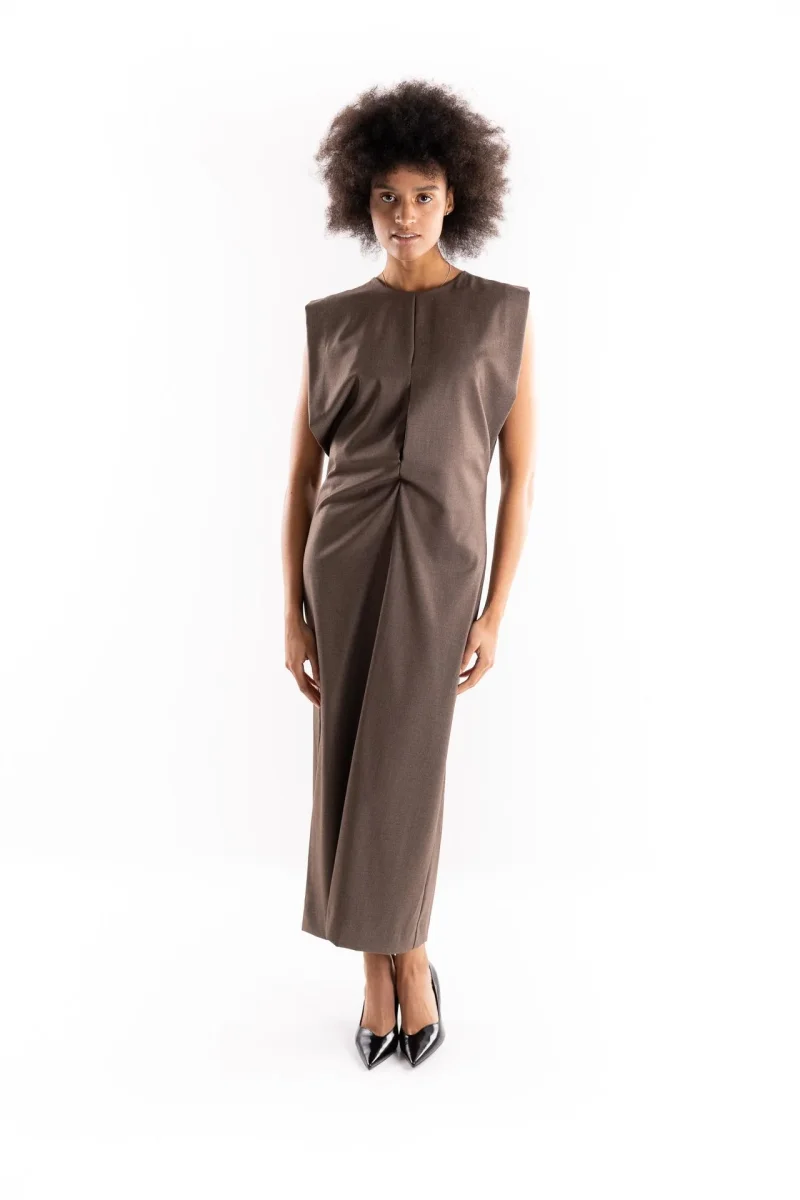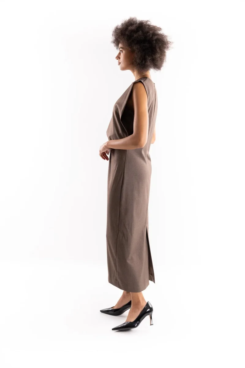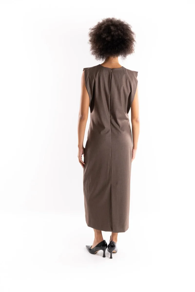 Abito lungo in tessuto color nocciola. Smanicato ampio con fodera interna . Parte superire accollata con arriciatura nel punto vita. Piccolo foro sul davanti. Chiusura con zip posteriore. Gonna lunga con spacco nella parte posteriore. Composizione 63% poliestere 34% viscosa 3% elastan. La modella รจ alta 1.79 e indossa una S