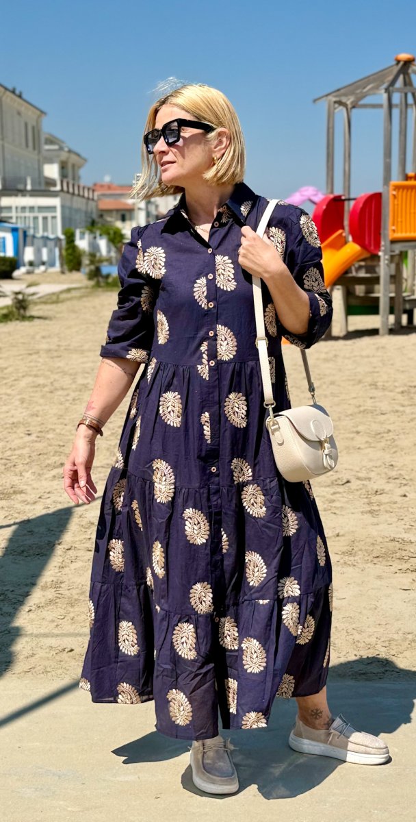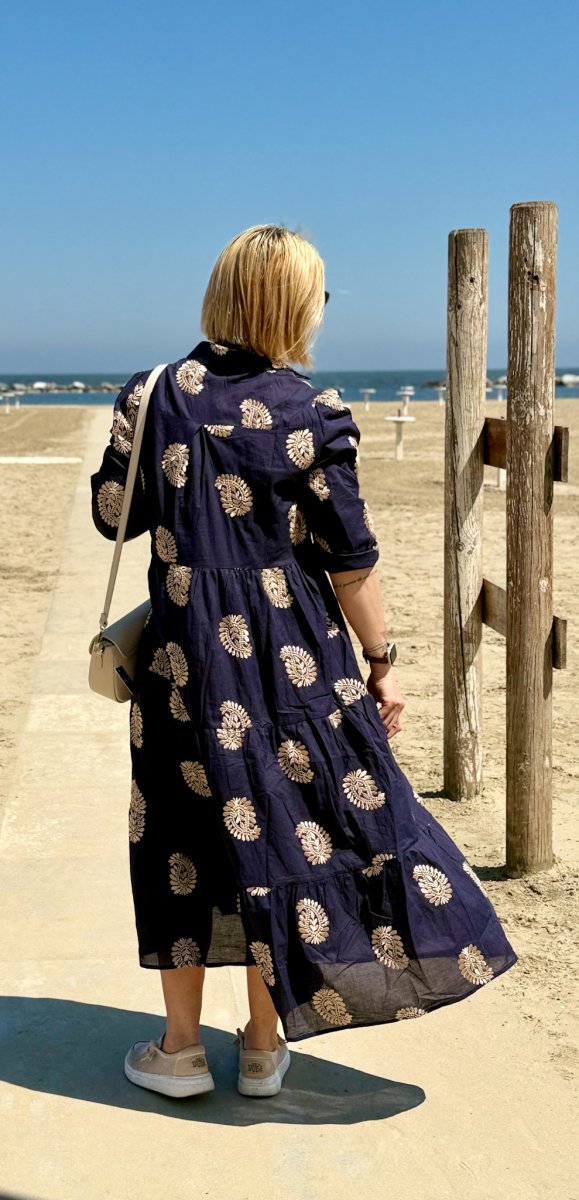 Il dettaglio che lo rende unico? I ricami dorati dal motivo floreale o geometrico, distribuiti su tutta la superficie dell’abito, che creano un elegante contrasto con il blu profondo del tessuto. Un capo versatile, ideale da indossare in vacanza, in città o per un’occasione speciale all’aperto.