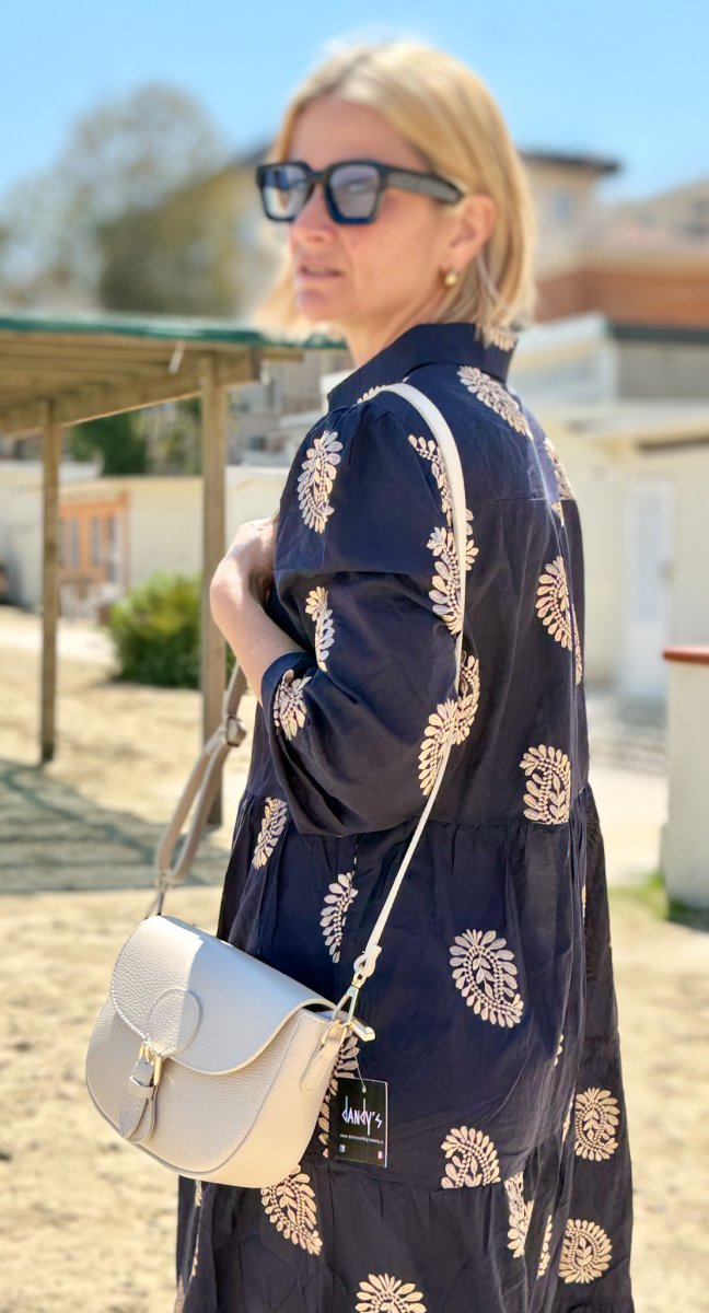 Scopri l’eleganza leggera e senza tempo del nostro abito lungo in cotone blu con ricami oro, un capo dal fascino etnico-chic pensato per accompagnarti con stile nelle giornate più calde.