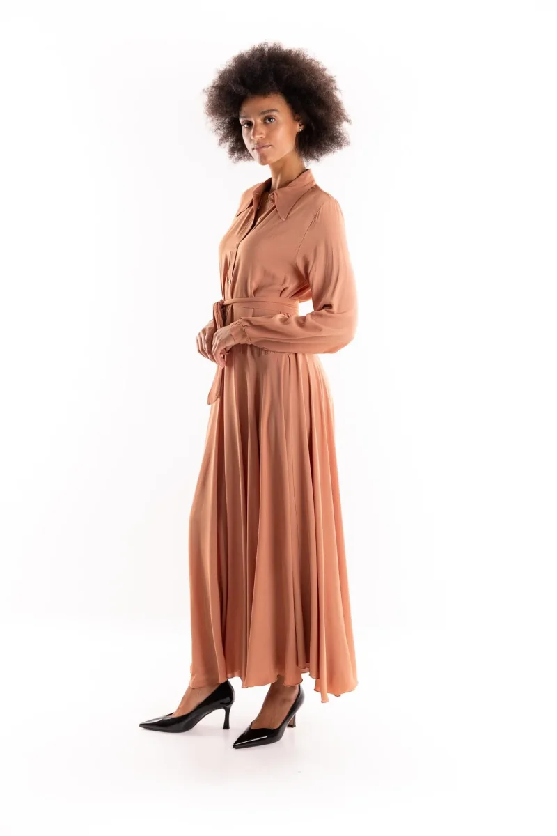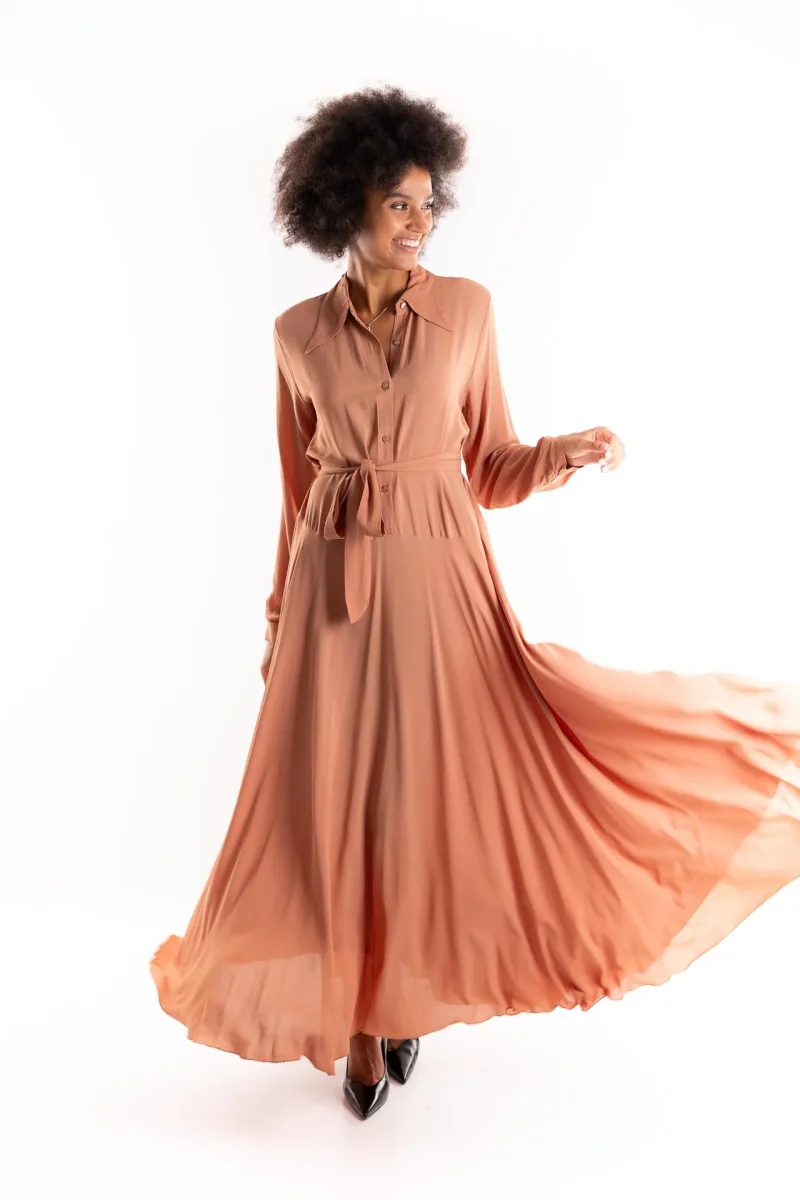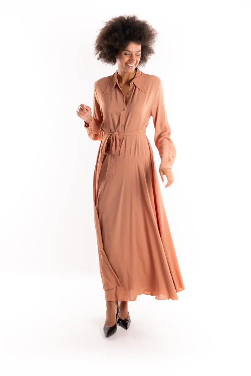 Abito lungo in tessuto color caramello. Abbottonatura frontale con colletto a camicia. Cucitura nel punto vita. Gonna ampia lunga. Fusciacca da annodare in vita. Maniche ampie con polisino nel finale. Composizione 100% viscosa. La modella รจ alta 1.75 e indossa una S