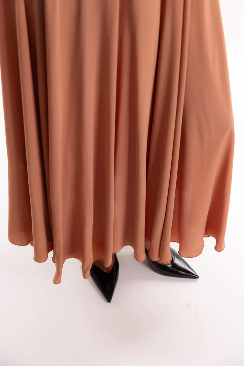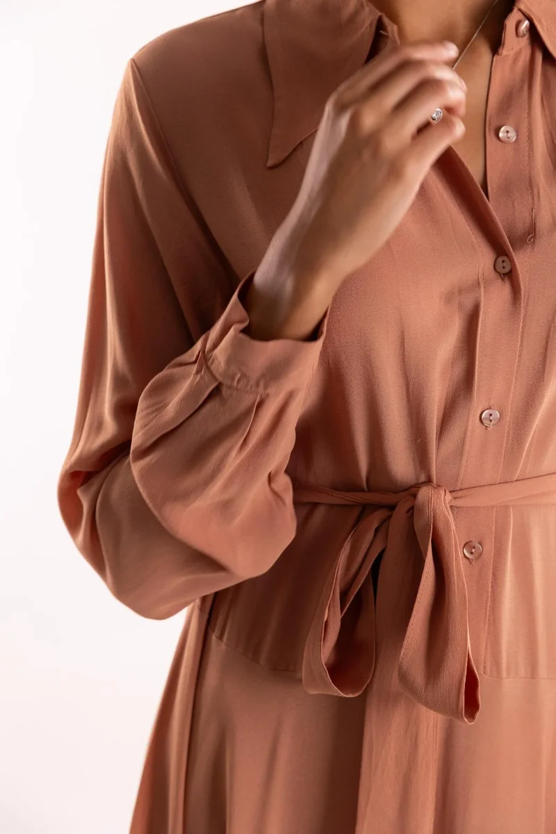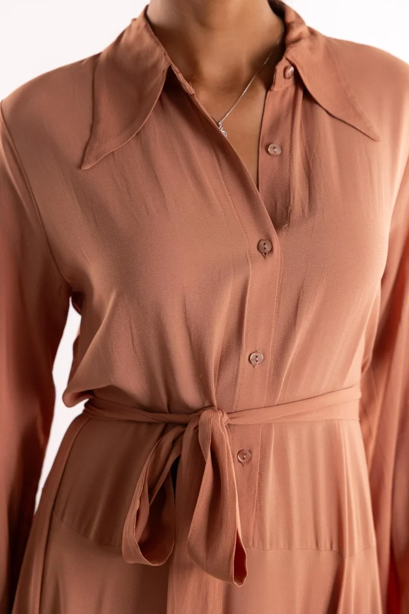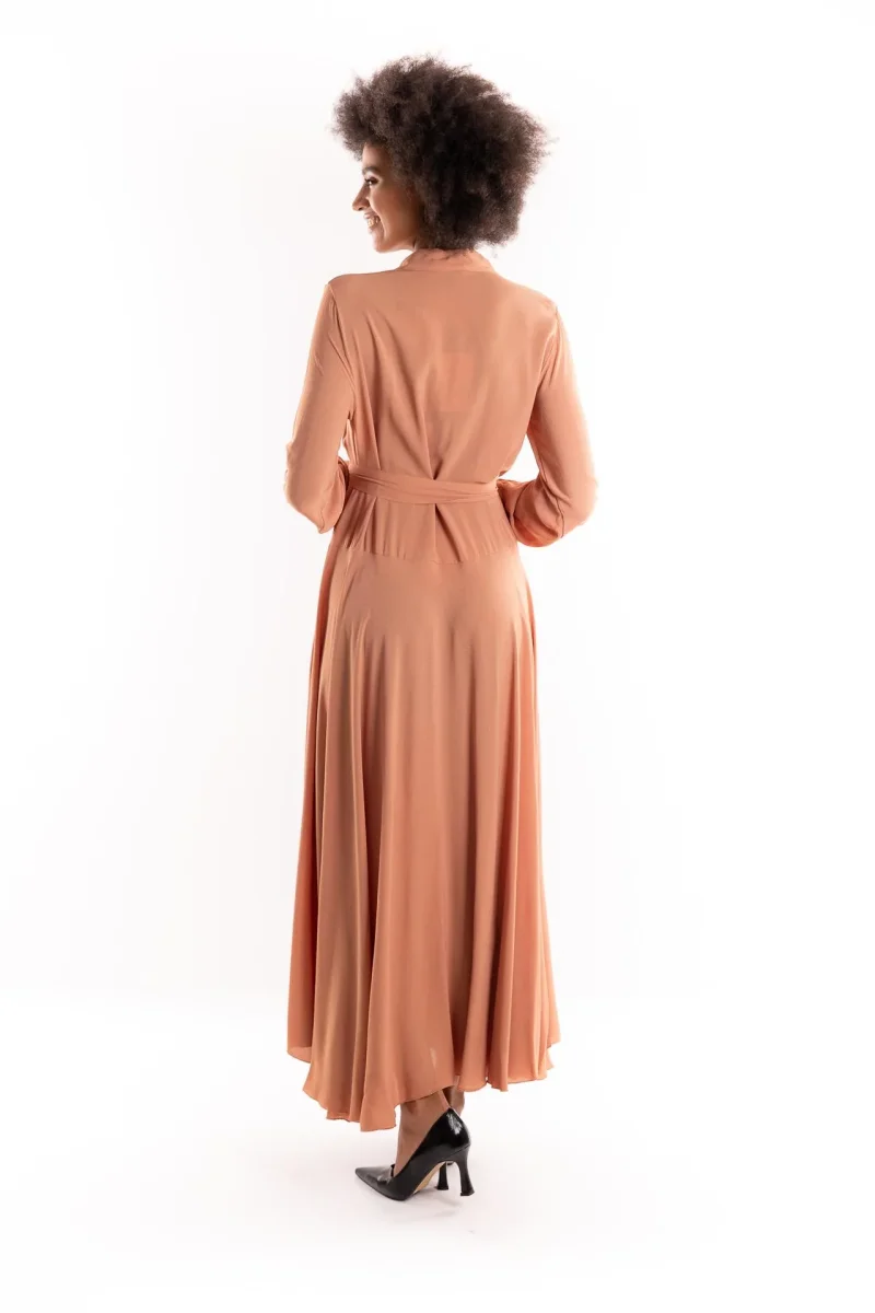 Abito lungo in tessuto color caramello. Abbottonatura frontale con colletto a camicia. Cucitura nel punto vita. Gonna ampia lunga. Fusciacca da annodare in vita. Maniche ampie con polisino nel finale. Composizione 100% viscosa. La modella รจ alta 1.75 e indossa una S