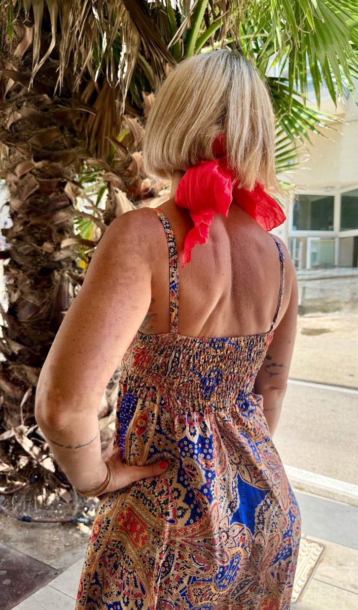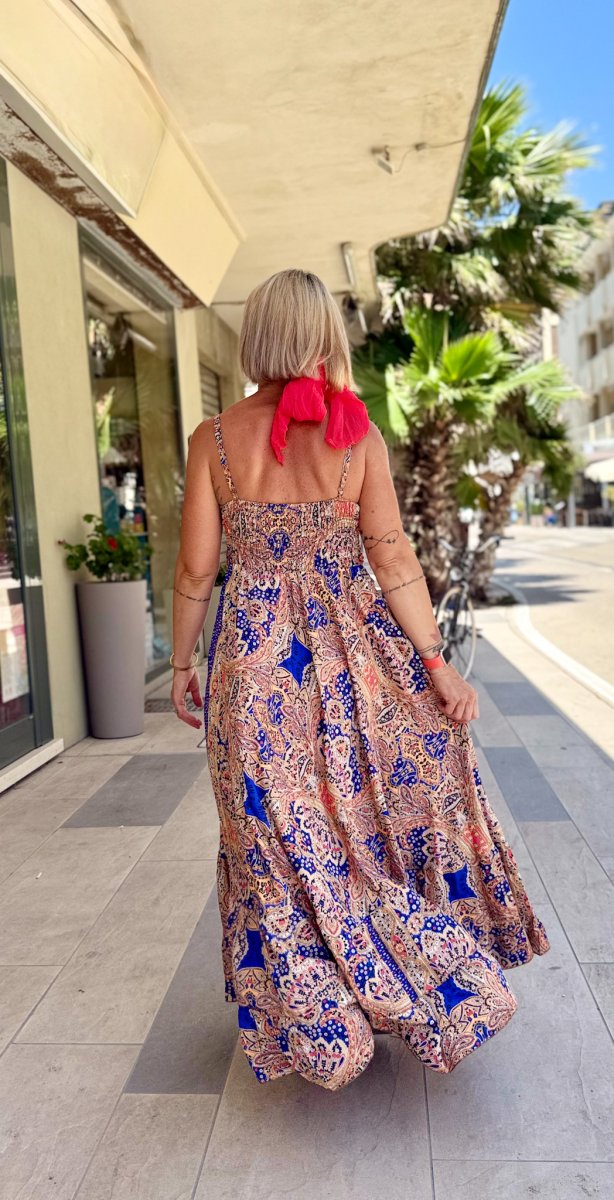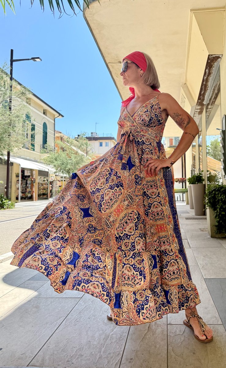 Questo abito รจ molto piรน di un semplice vestito: รจ una dichiarazione di stile. Indossalo per esprimere la tua personalitร libera e colorata, tra comfort, eleganza e spirito nomade.