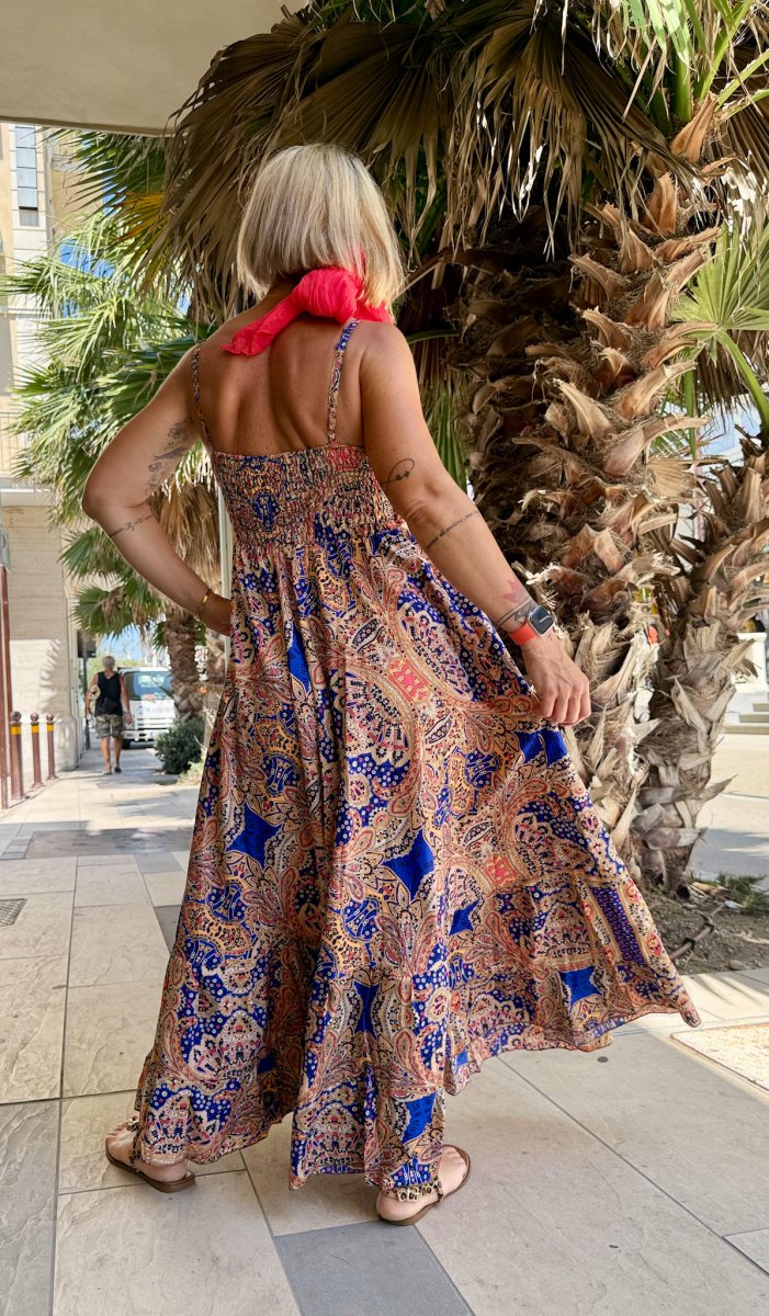 Abito Lungo in Seta Indiana con Bretelle Regolabili โ Stampa Etnica e Gonna Ampia