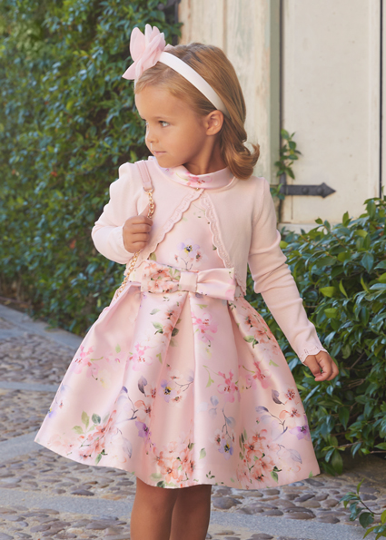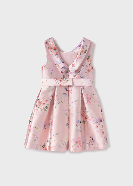 Abito mikado con stampa floreale per bambina. Fodera interna in cotone. Fusciacca con grande fiocco. Collo a barca e scollatura sulla schiena. Chiusura posteriore con cerniera nascosta.