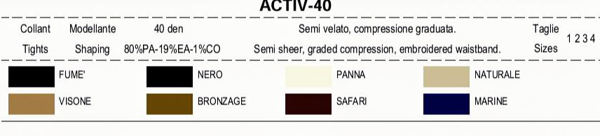 QUANTITA’ MINIMA DI ACQUISTO 3 PAIA PER COLORE E TAGLIA Active 40 collant semi velato Corpino modellante compressione graduale Denari: 40 Taglie: 1 2 3 4 Composizione: 80% Nylon 19% Elastan (Lycra) 1% Cotton http://www.girardi.net ALTRI PRODOTTI NELLA CATEGORIA