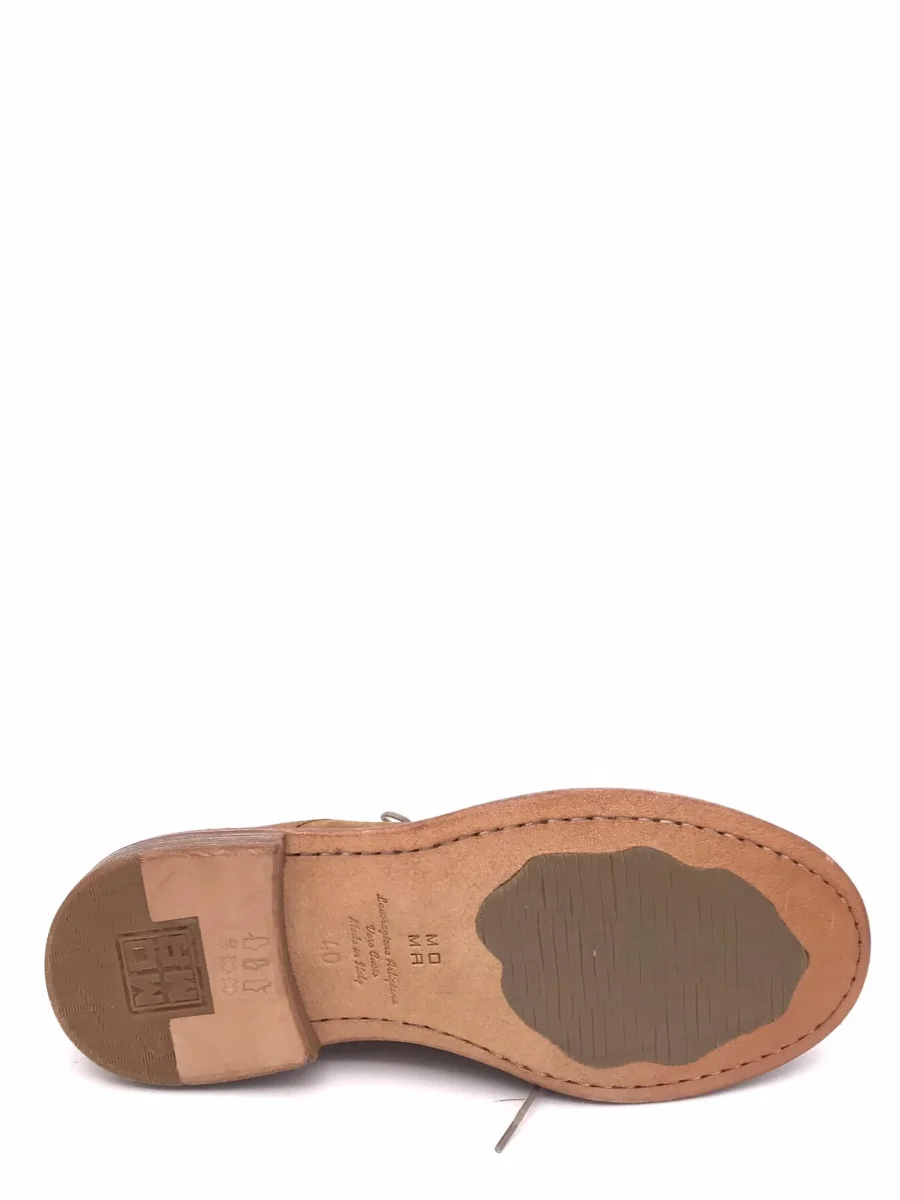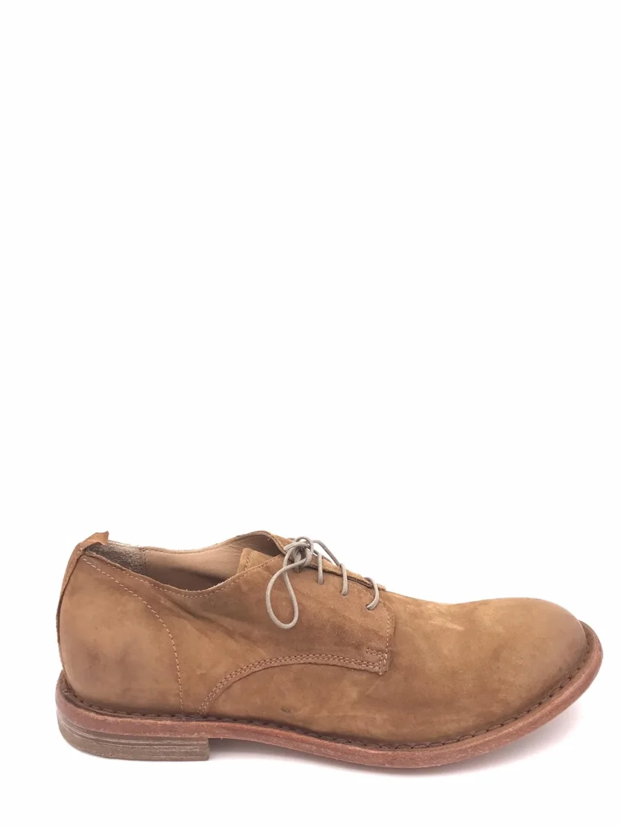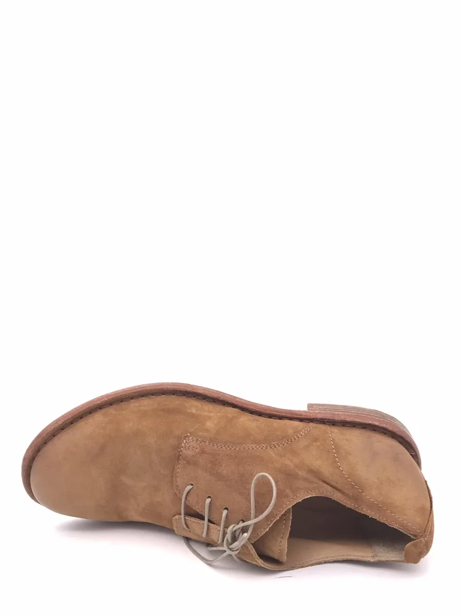 Scarpa allacciata in camoscio color cuoio con effetto vissuto. Fodera interna in pelle. Suola in cuoio con inserto antiscivolo in gomma e guardolo cucito. Lavorazione artigianale.