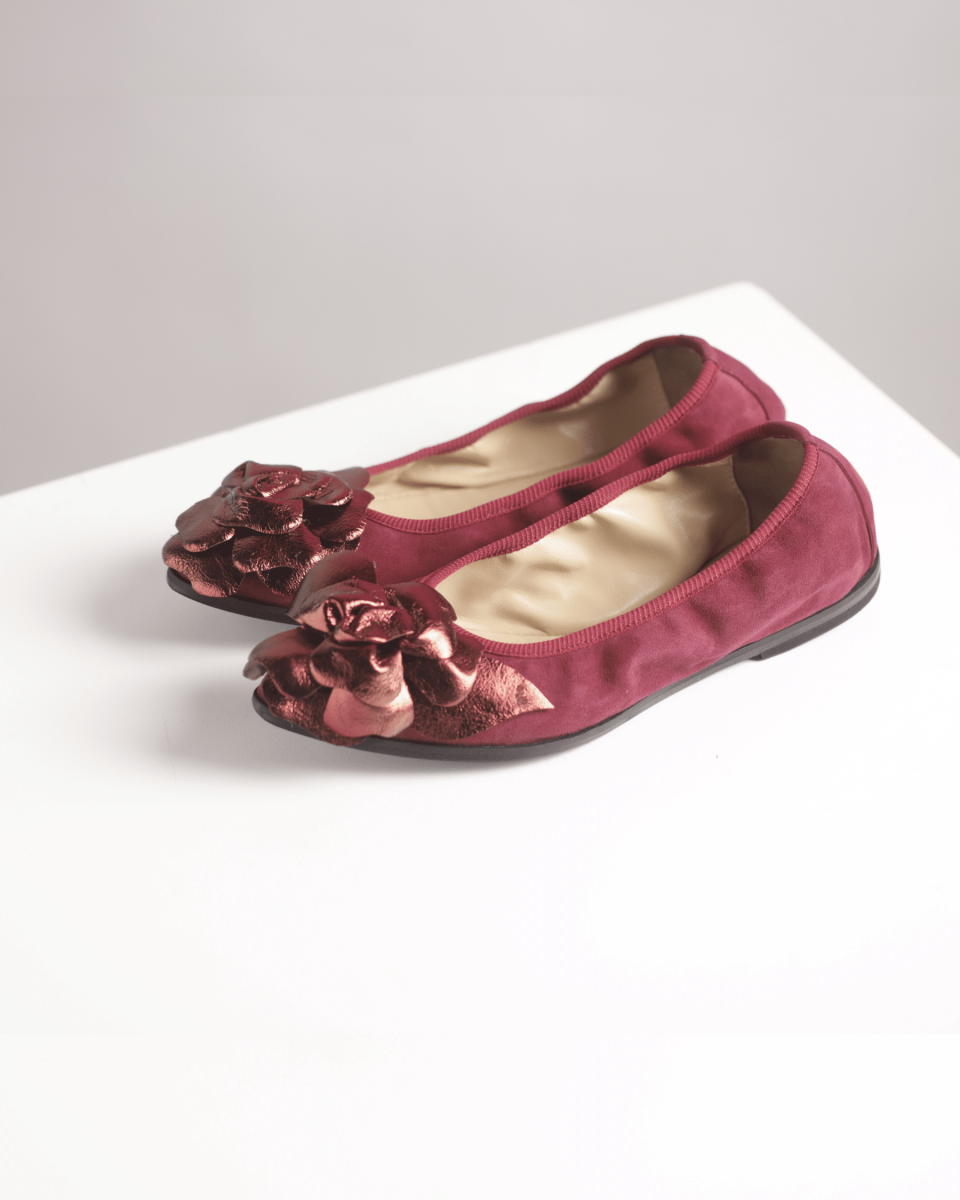 Ballerina a punta realizzata artigianalmente a mano in morbido camoscio amaranto con maxi fiore tridimensionale in laminato bordeaux.