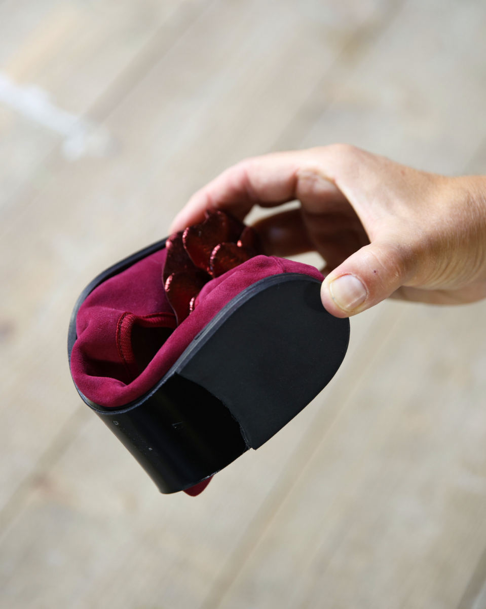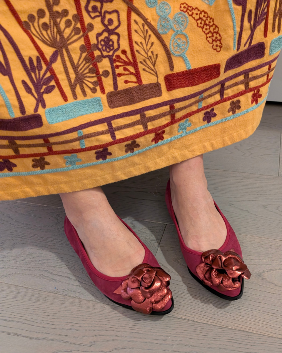 Le โballet shoesโ non sono mai passate del tutto di moda, grazie al loro mix unico di praticitร ed eleganza che continua a conquistare tutte le generazioni. Diventate celebri ai piedi di intramontabili icone del cinema americano, sono fedeli compagne della tua quotidianitร , ma anche una sofisticata alternativa serale ai tacchi. Una ballerina a punta realizzata artigianalmente a mano in un morbidissimo camoscio amaranto e maxi fiore in laminato bordeaux, un modello destrutturato, leggerissima e super flessibile grazie alla sapiente lavorazione a sacchetto. Un modello colorato per un look iper femminile e contemporaneo. Pixie รจ una ballerina destrutturata con calzata…