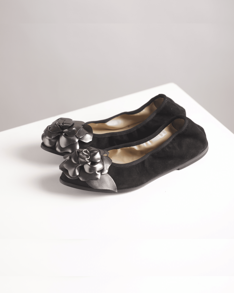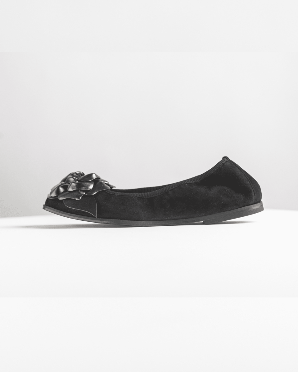 Ballerina a punta con maxi fiore tridimensionale realizzata artigianalmente a mano in un morbidissimo camoscio nero.