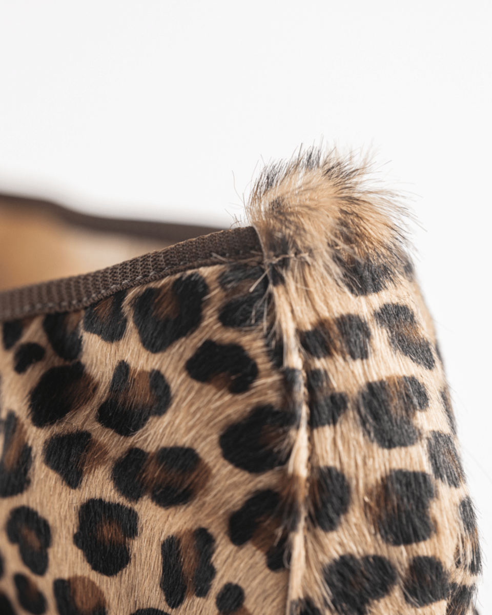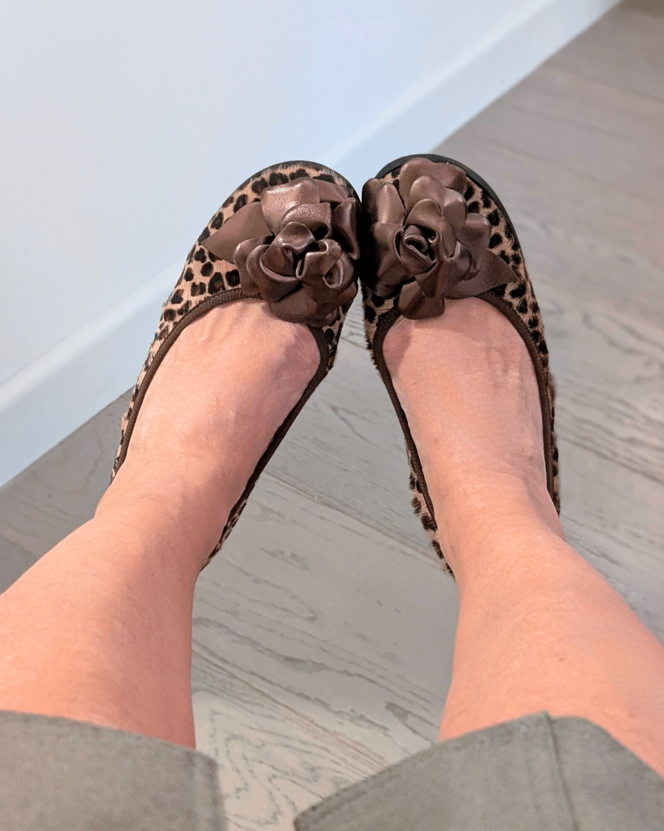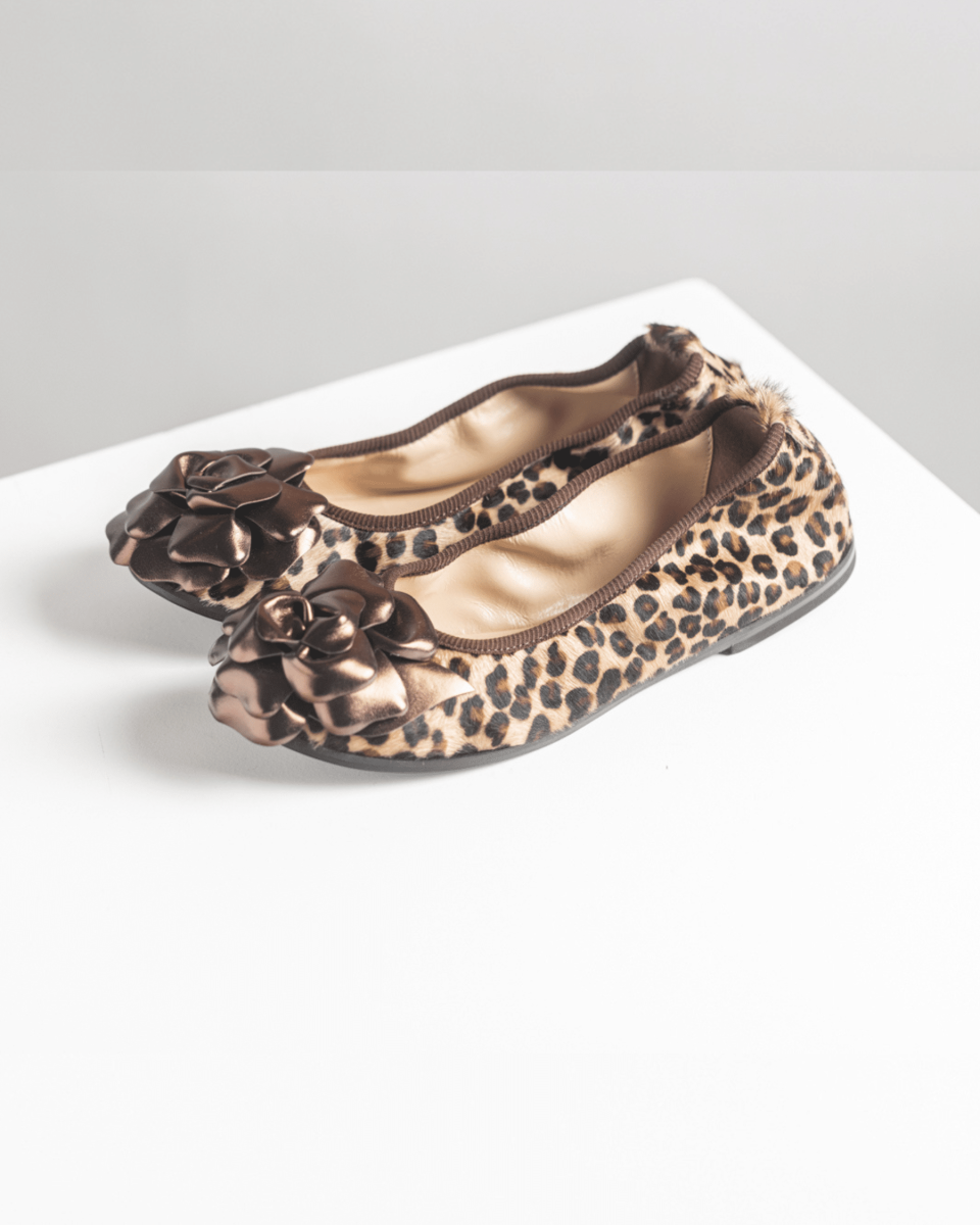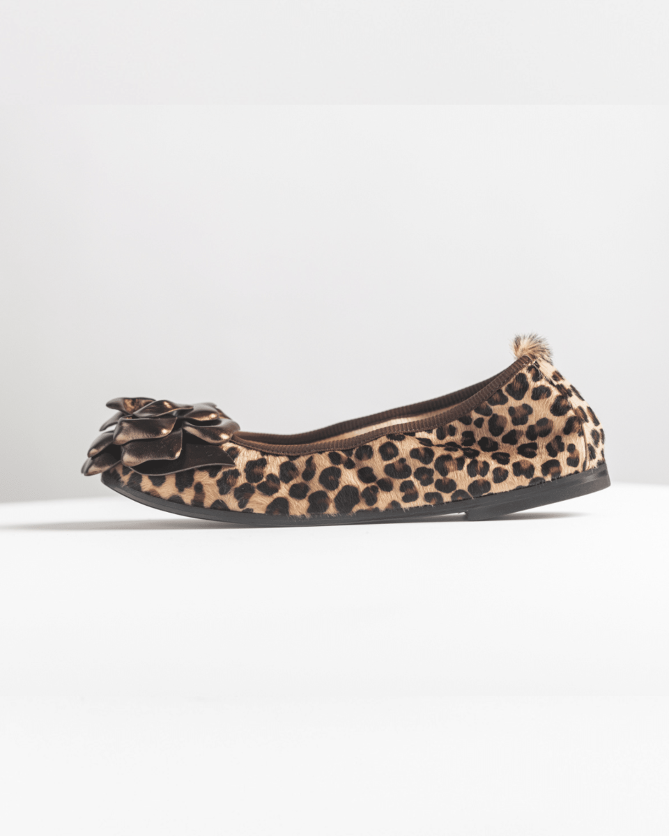Ballerina a punta tonda con maxi fiore tridimensionale realizzata artigianalmente a mano in un grintoso cavallino maculato con stampa animalier.