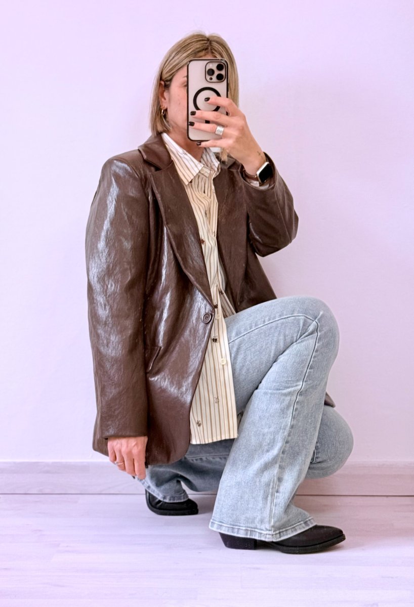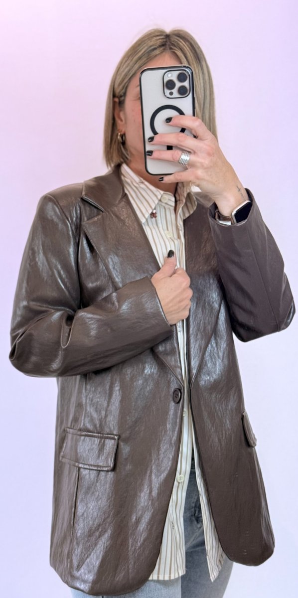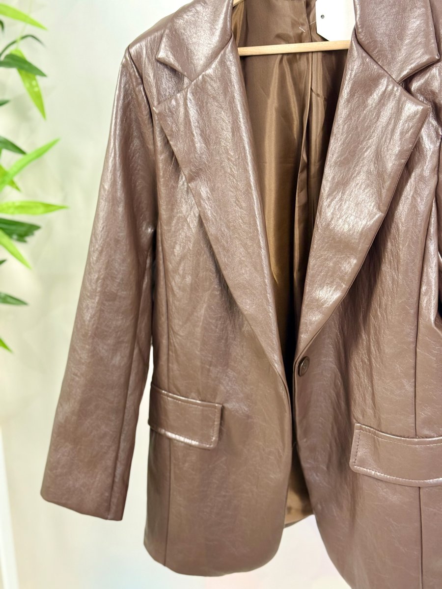 Blazer in Simil-Pelle con Bottone Singolo Color Testa di Moro – Eleganza e Modernità per Ogni Occasione