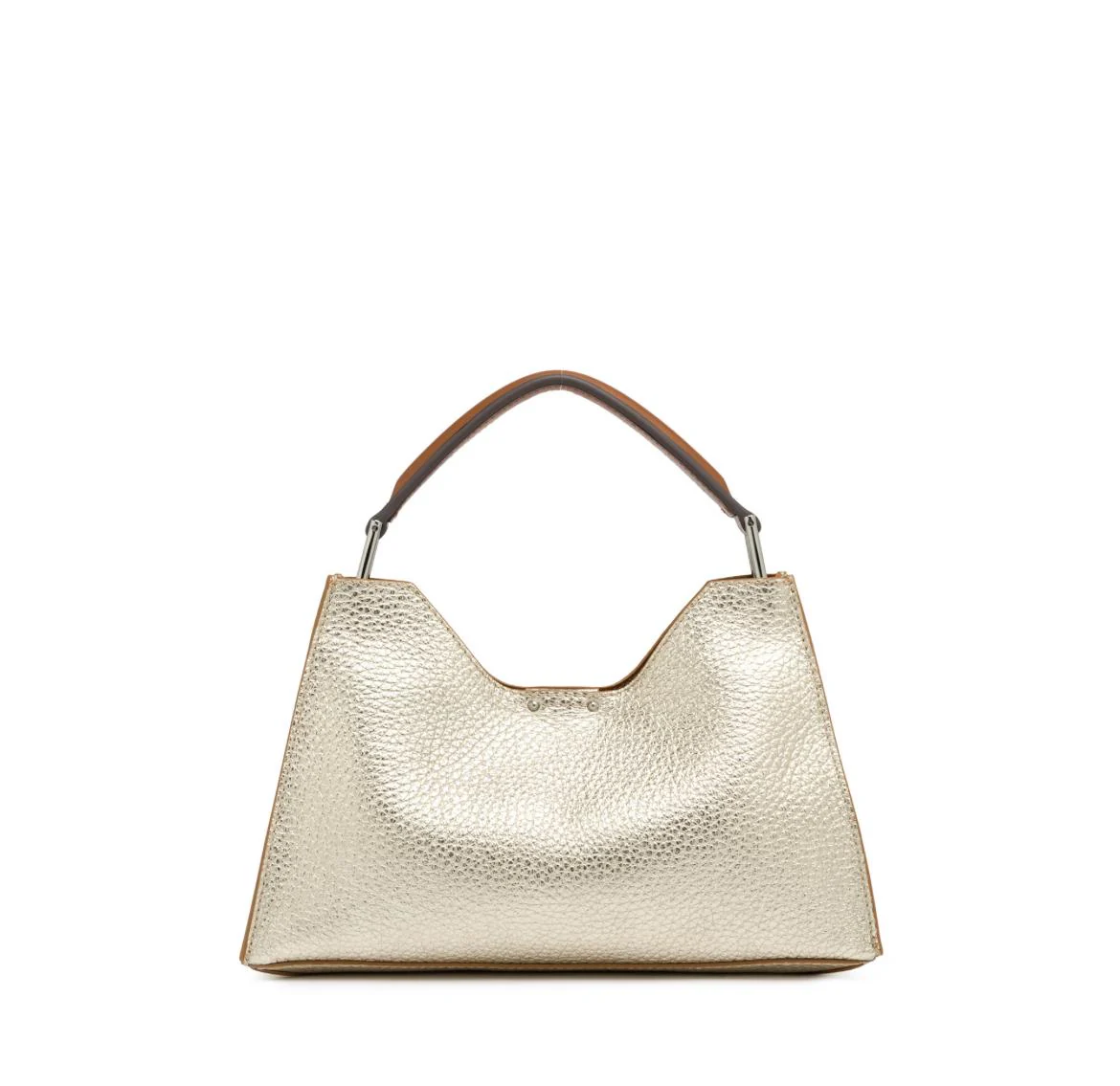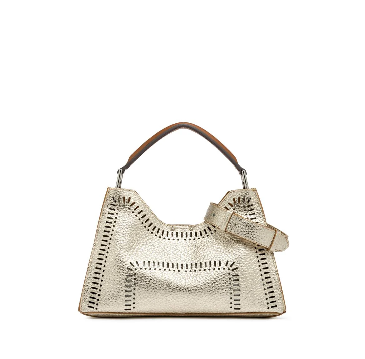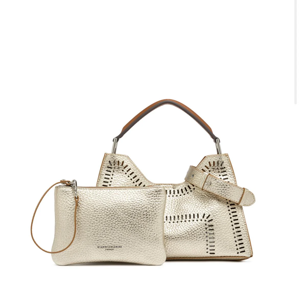 La borsa della collezione Aurora by Gianni Chiarini Firenze, caratterizzata da una forma trapezoidale, รจ realizzata in pelle double grana maxi color platino e arricchita con dettagli in metallo. Laserature intagliate nel pellame. Sinonimo di eleganza contemporanea, รจ dotata di una pratica tracolla in pelle regolabile e removibile, e include una pochette coordinata. Presenta una chiusura superiore con magnete. Dimensioni: 32x22x11 cm.