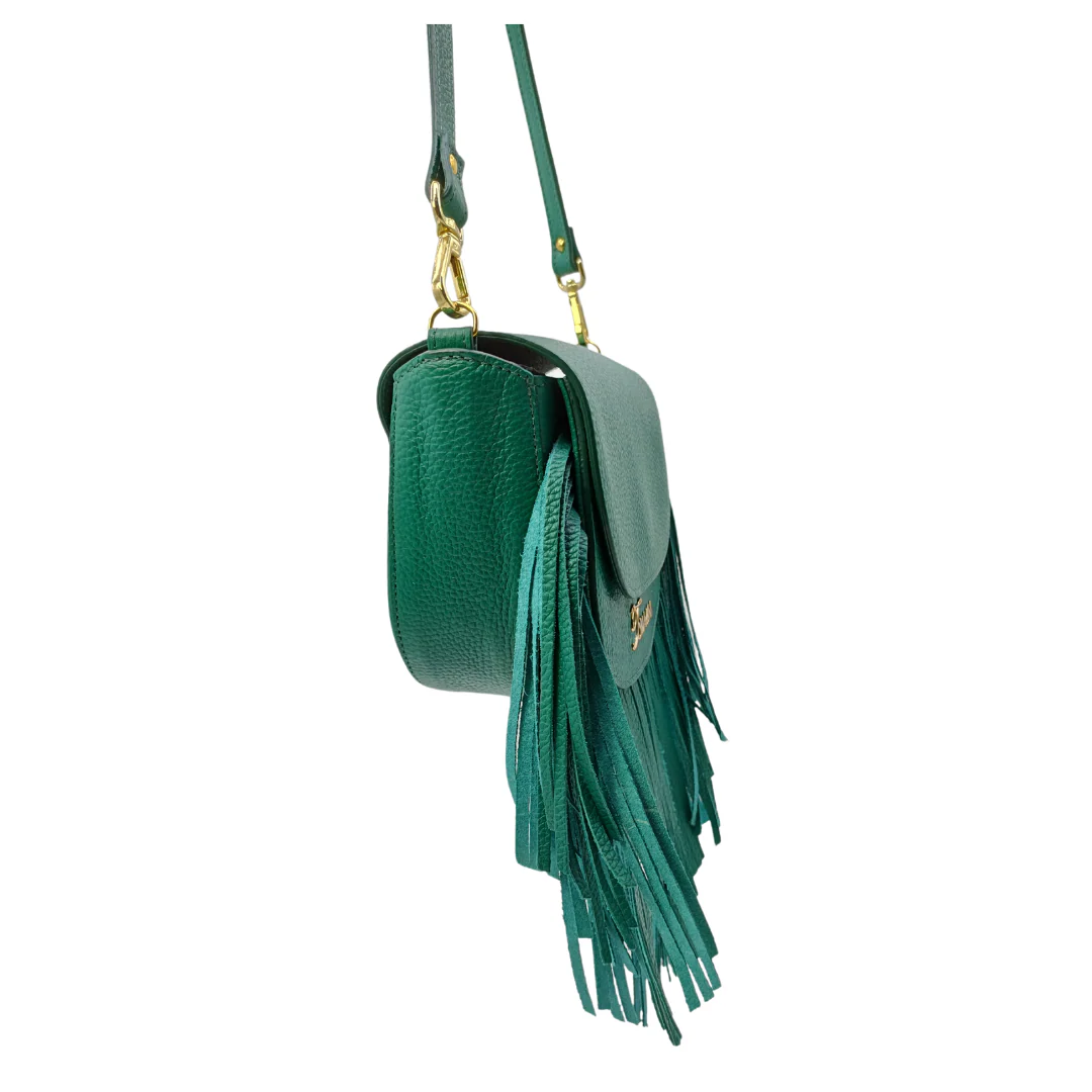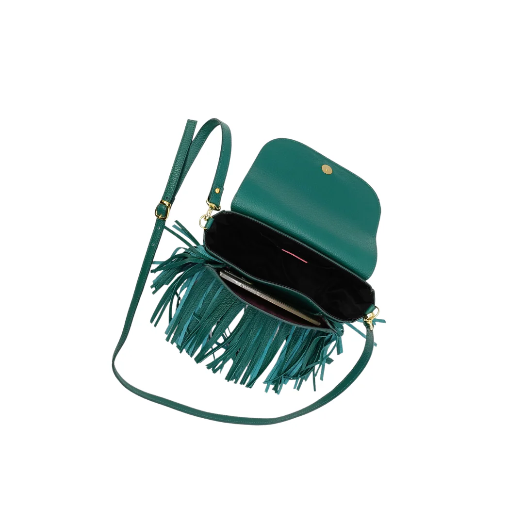 • E’ una borsa che mantiene la forma, con una struttura rigida che definisce la sua linea, a cui si aggiunge il movimento frizzante delle frange.