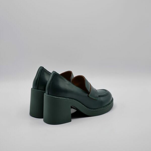 Mocassino in morbida pelle verdone, forma arrotondata, tacco largo di 7,5cm, fondo gomma.