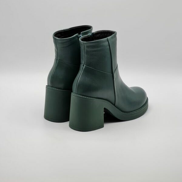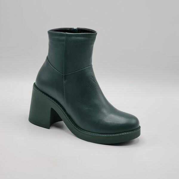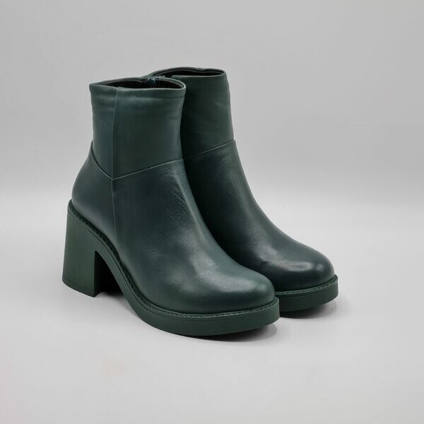 Stivaletto in in morbida pelle Verdone, tomaia liscia, forma arrotondata, tacco largo di 7,5 cm, zip laterale di chiusura.