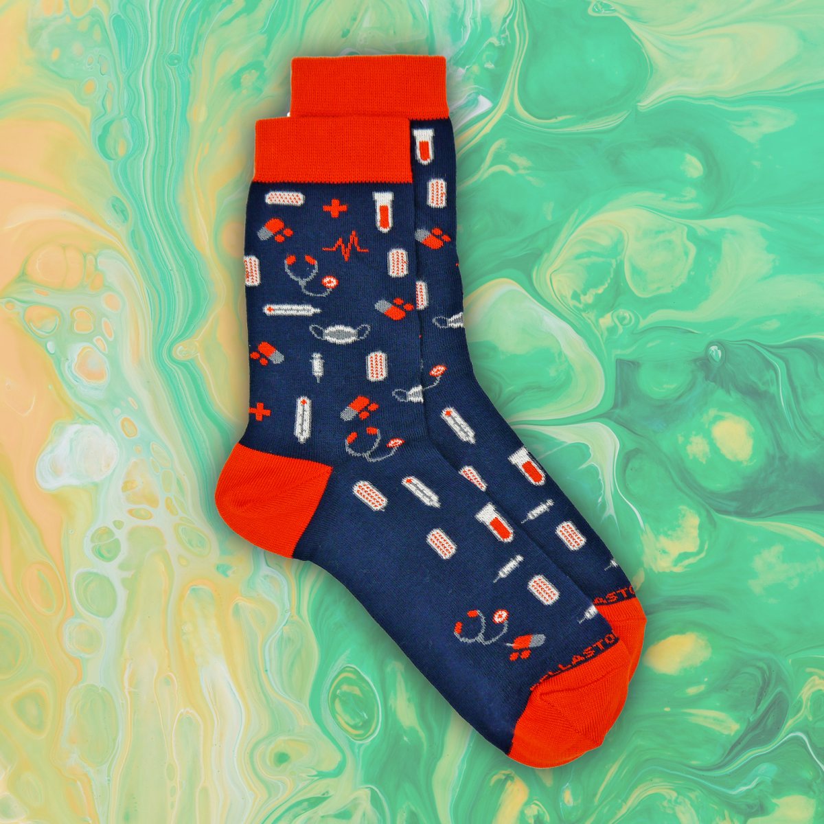 C’era una volta una ragazza dai capelli rossi molto determinata e volenterosa. Ricordo il suono della sua sveglia che suonava alle 4 del mattino, ricordo il profumo dei mille cappuccini che sorseggiava e le facevano compagnia, mentre era intenta a scoprire le cause e le conseguenze di ogni patalogia. Ricordo la sua passione nel raggiungere i suoi obiettivi prefissati, e non potevo non creare dei calzini per Lei. Lei, è mia sorella che oggi è una bravissima Dottoressa in Medicina. Calzini Dottore con tutto ciò che occorre per il kit primo soccorso: stetoscopio, cerotti, termometro, compresse, mascherina… Pronti a regalare…