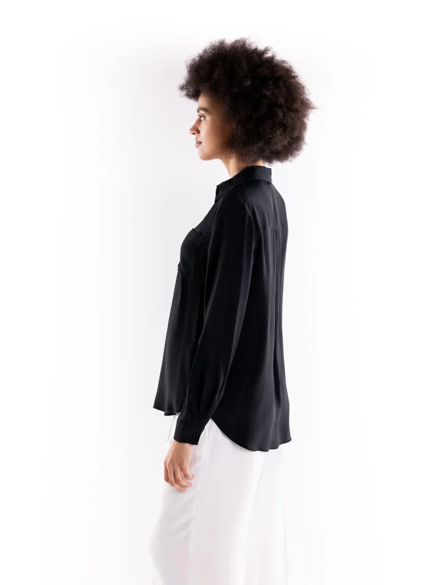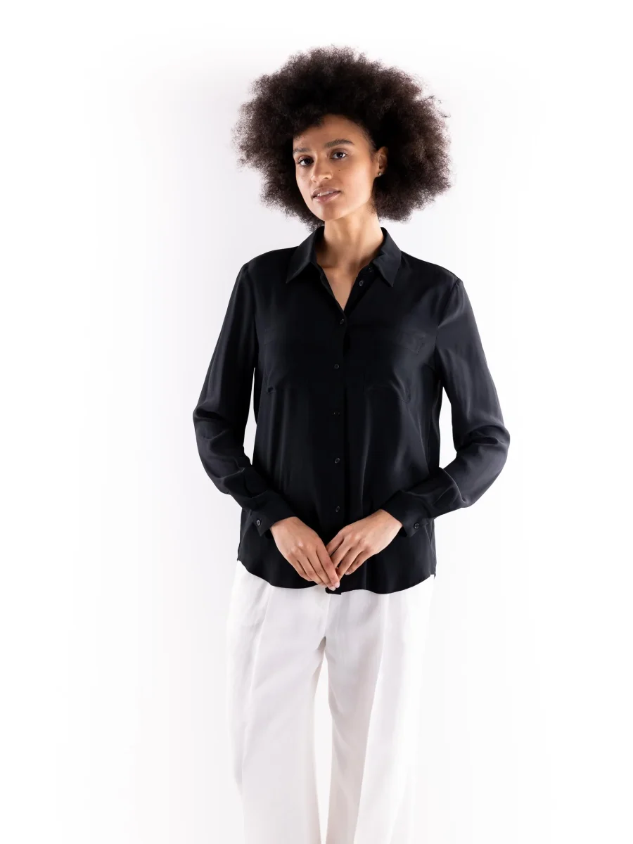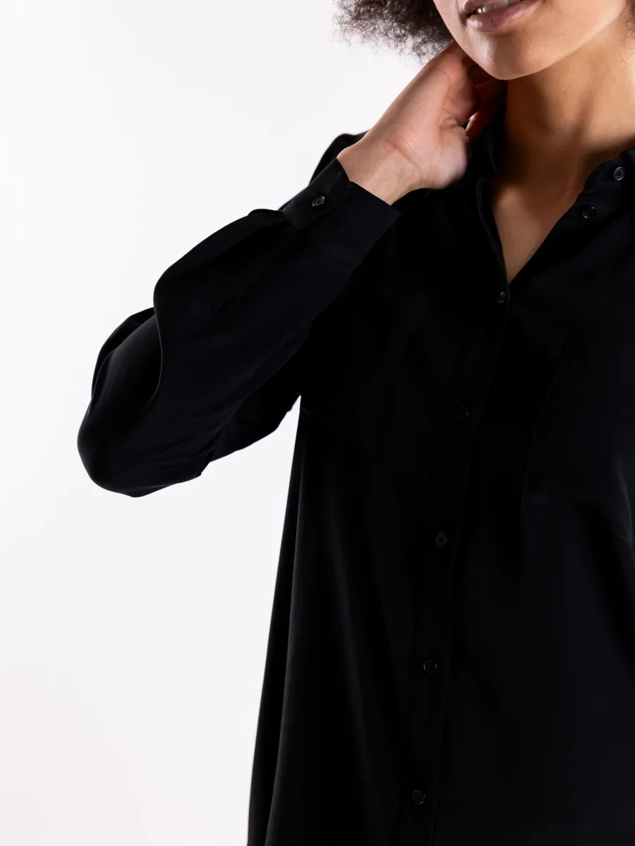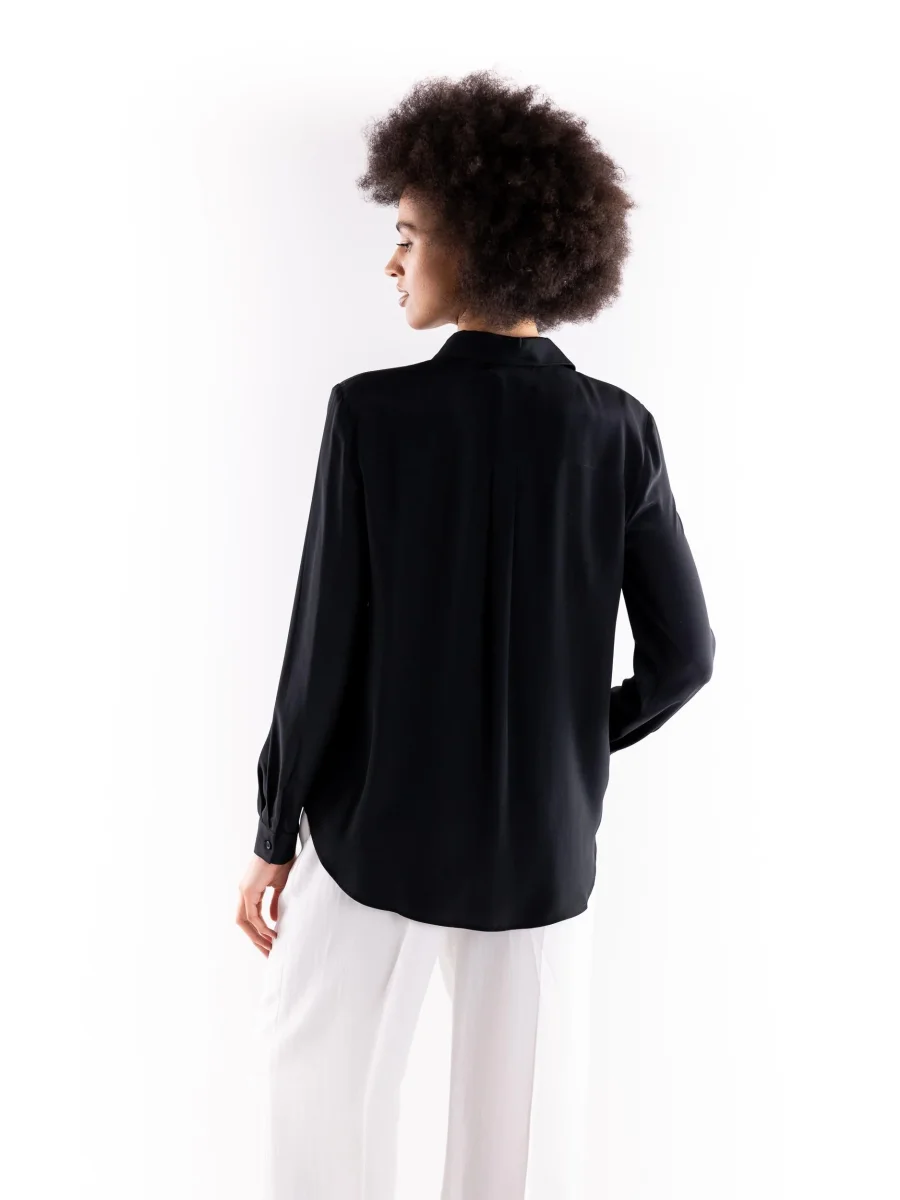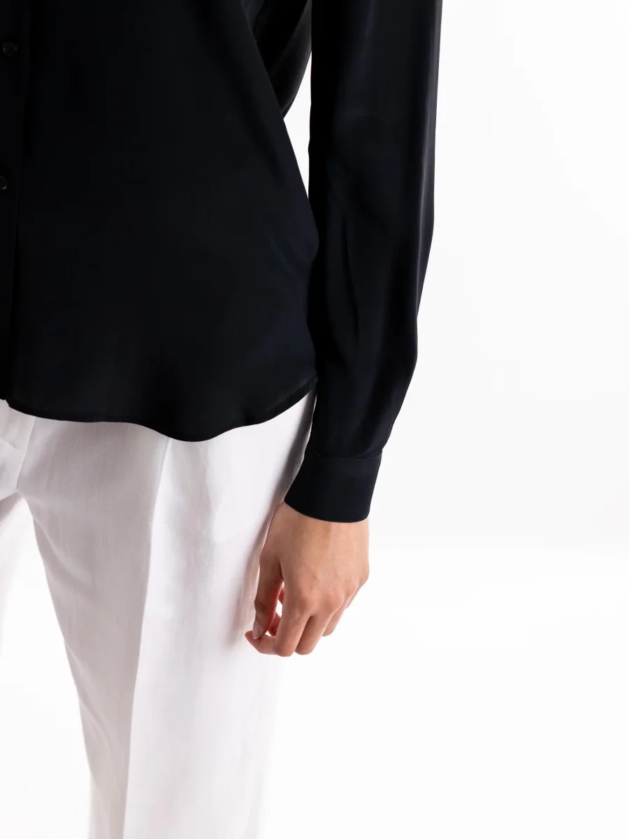 Camicia New Nora in tessuto fluido nero. Colletto a punta, maniche lunghe e chiusura con bottoni. Vestibilitร regolare. Composizione 69% acetato 31% seta. La modella รจ alta 1.75 e indossa una 40