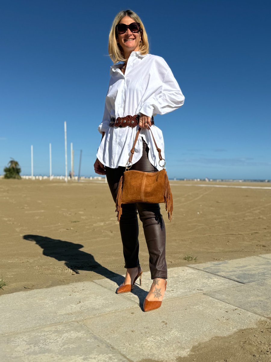 Il design oversize regala una vestibilità morbida e avvolgente, permettendo di muoversi liberamente senza rinunciare alla femminilità . Il classico colletto e la chiusura frontale con bottoni conferiscono un tocco elegante e senza tempo, mentre il taglio lungo e ampio la rende estremamente versatile: può essere indossata come camicia, come copricostume in spiaggia o come giacca leggera nelle mezze stagioni.