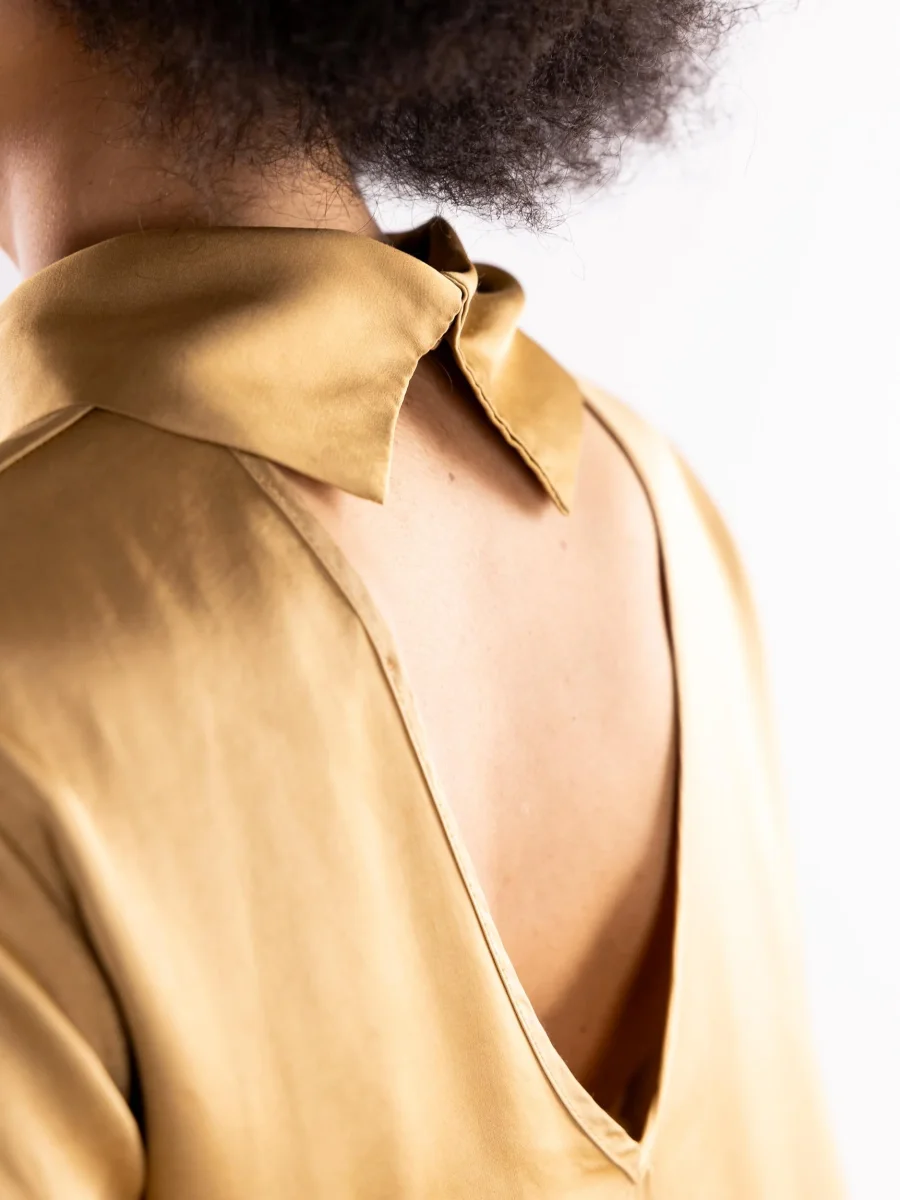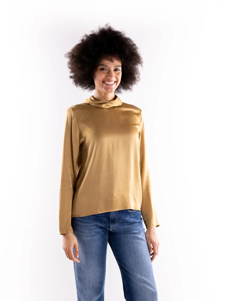 Camicia senza bottoni Sublime in tessuto fluido color camel. Colletto morbodo con chiusura dietro al collo, maniche lunghe. Scollo a goccia nella schiena. Vestibilitร regolare. Composizione 100% viscosa. La modella รจ alta 1.75 e indossa una S