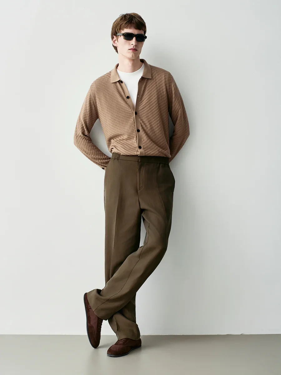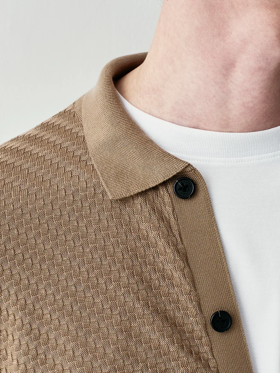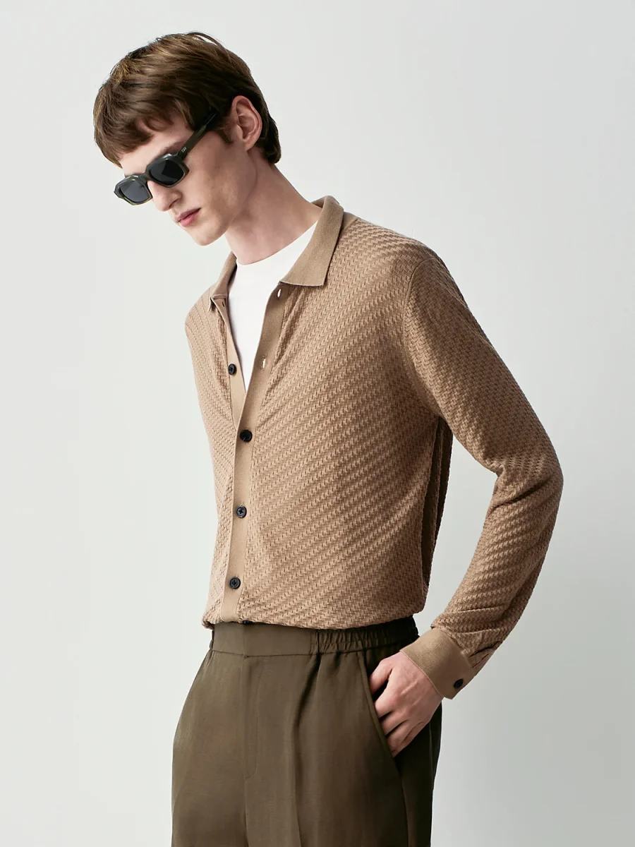 CARDIGAN COLLO CAMICIA CHIUSURA FRONTALE CON BOTTONI COLLO, POLSI E FONDO IN MAGLIA RASATA MAGLIA IN MISTO SETA TEXTURED VESTIBILITร REGOLARE