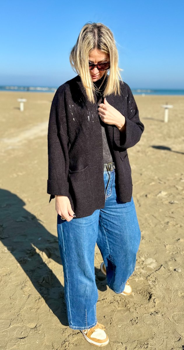 Realizzato in un tessuto morbido e confortevole, questo cardigan si caratterizza per la sua linea aperta senza chiusure, che lo rende estremamente pratico e versatile. Le micro pailettes donano un raffinato effetto brillante, capace di catturare la luce e valorizzare il look senza risultare eccessivo, rendendolo adatto sia al giorno che alla sera.