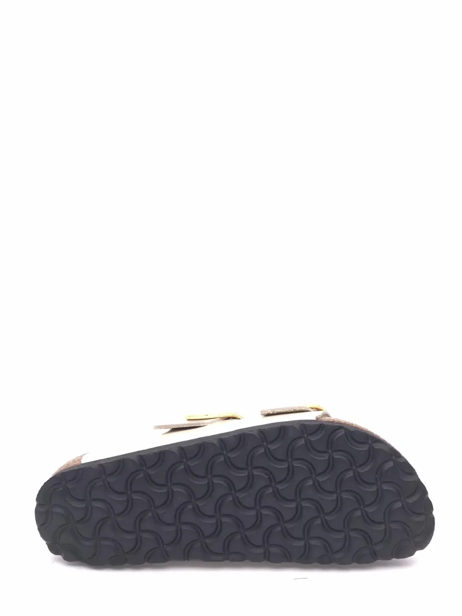 Ciabatta modello Arizona Big Buckle cod. 1026128. Plantare anatomico in sughero e lattice semi-exquisit. Tomaia in pelle semilucida beige e sottopiede in pelle liscia in colore coordinato. Suola in EVA. Dettaglo di due cinturini con fibbia ad ardiglione in metallo oro regolabili individualmente. Made in Germany