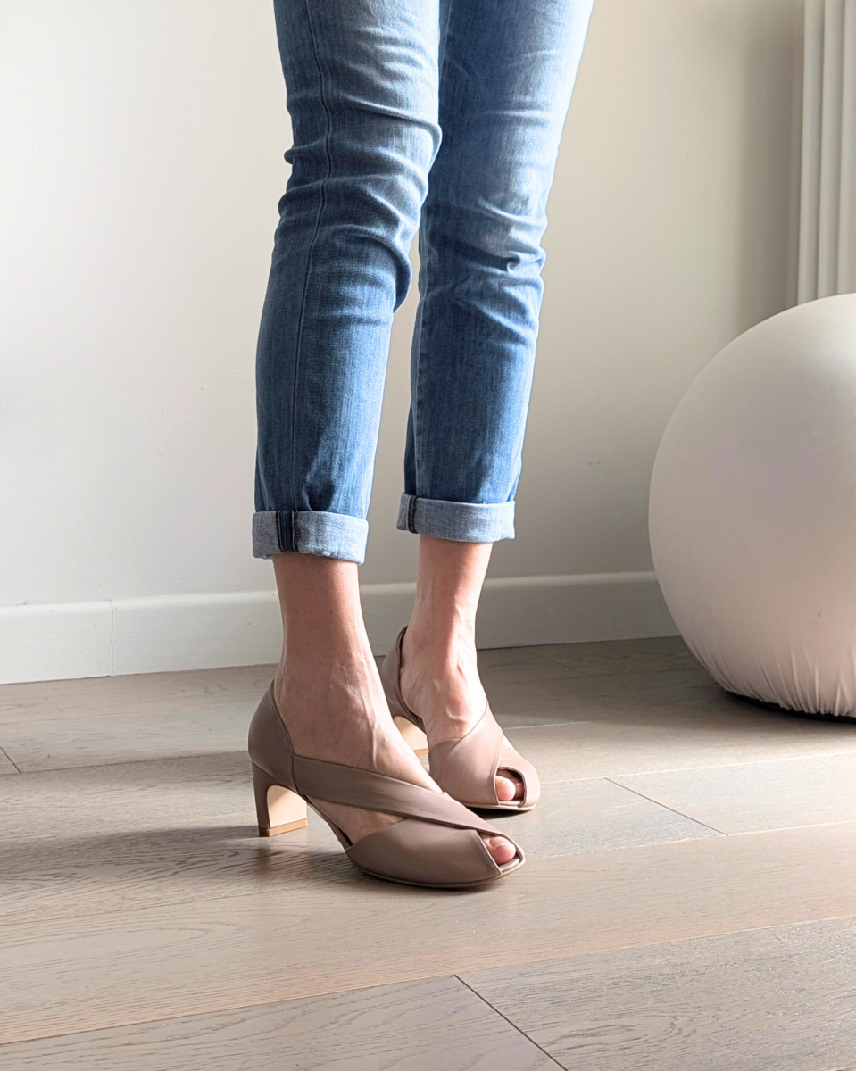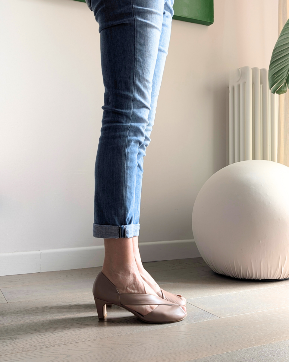 Décolleté asimmetrico con la punta aperta e una silhouette retrò, Diana è un modello a punta larga realizzata artigianalmente a mano a Porto Sant’Elpidio (Fermo – Marche) in nappa nude, per una eleganza d’altri tempi.