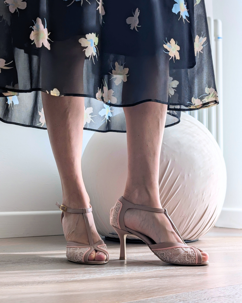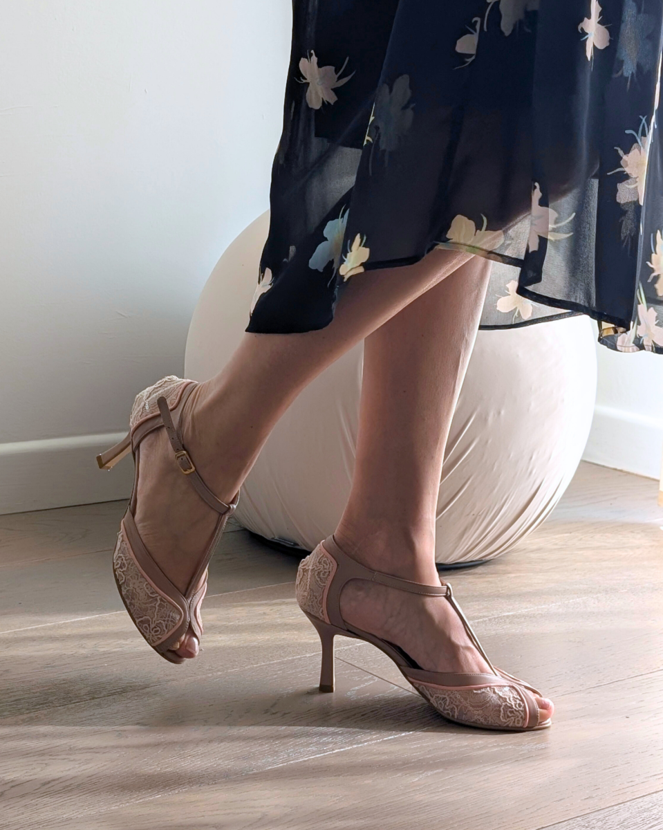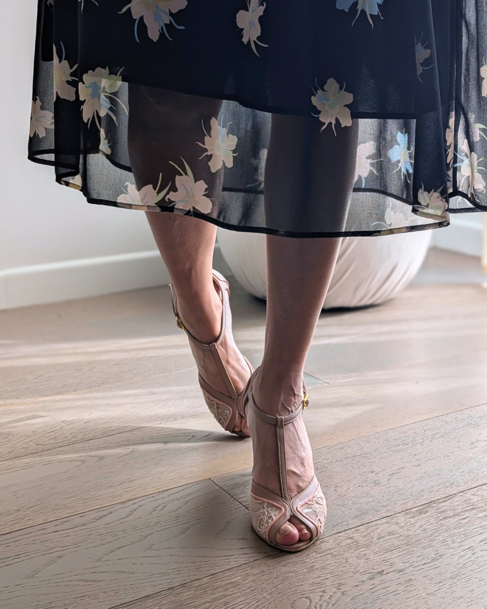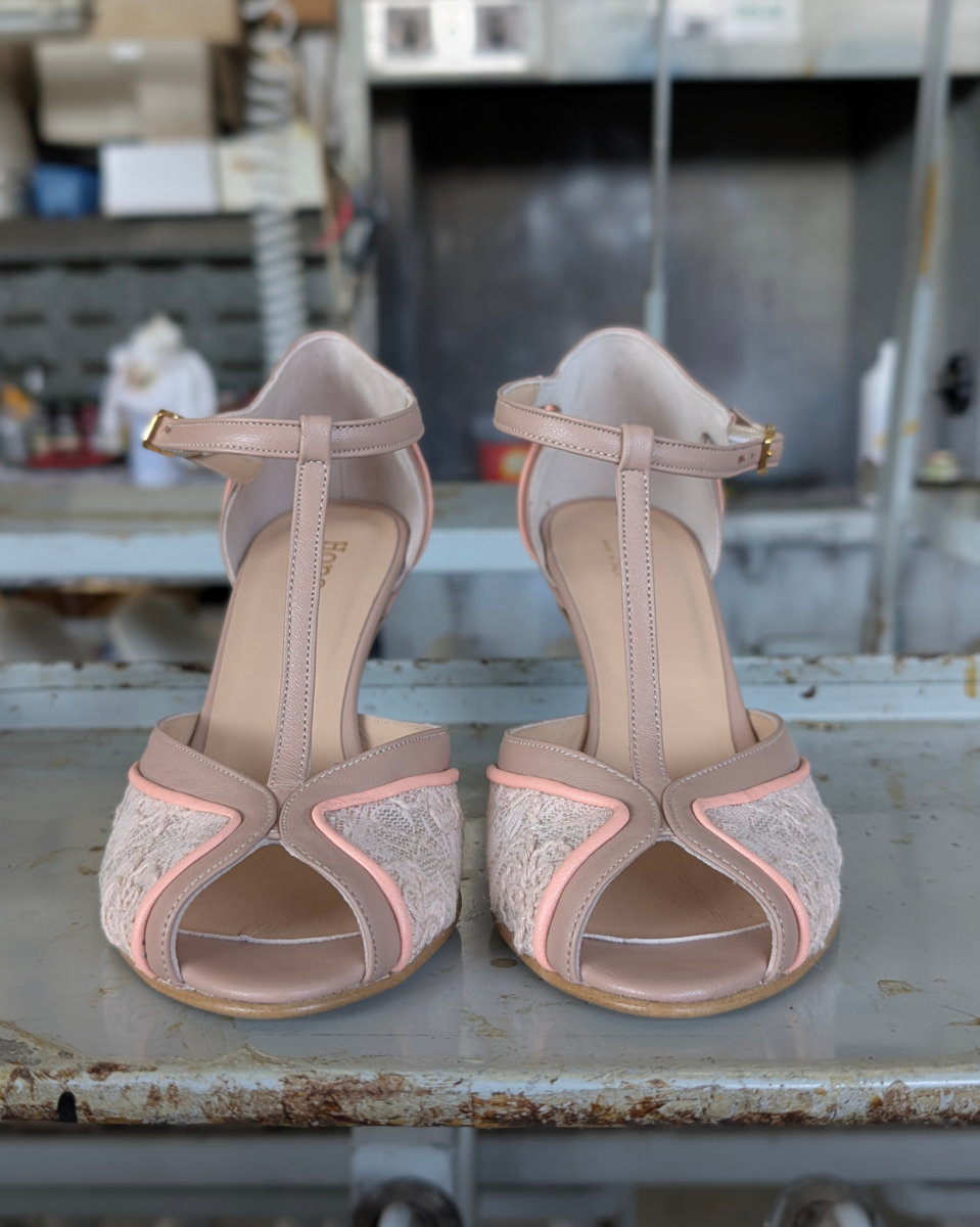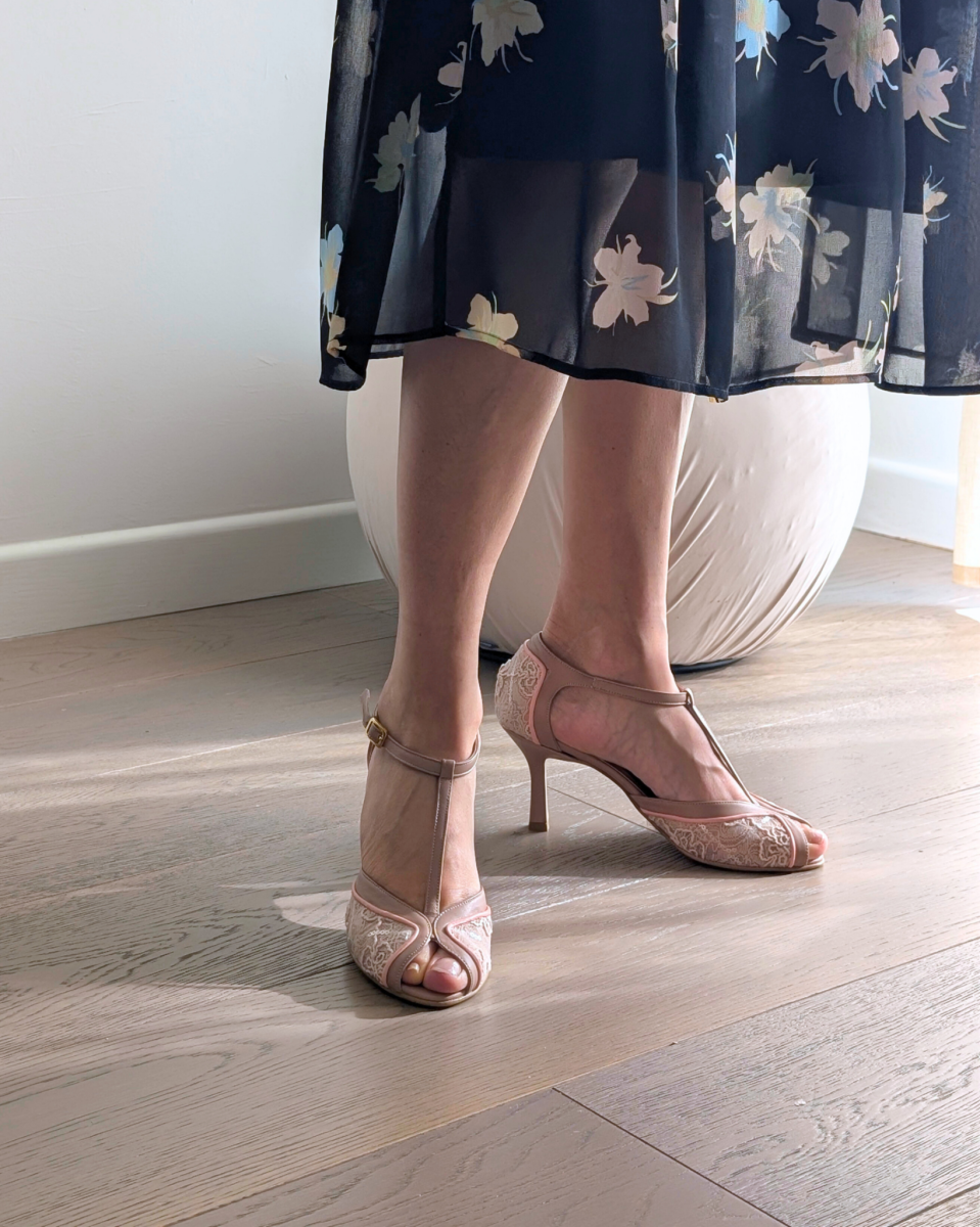 Nate per ballare a ritmo di jazz e charleston durante l’epoca del proibizionismo, indossate dalle Flapper Girls nei mitici Anni Ruggenti, le scarpe t-bar sono ancora oggi modelli molto amati e indossati per la loro stabilità ed eleganza. Anafi, la nostra amatissima décolleté spuntata t-bar con tacco femminile di 7 cm, è realizzata artigianalmente a mano in tessuto bijoux cipria, cinturino t-bar in nappa nude e profilo sottile in nappa rosa carne. Una combinazione di colori e materiali dall’appeal romantico e vintage. La nostra tanghera puntata ha calzata regolare e precisa, adatta a un piede con pianta da sfilata a…