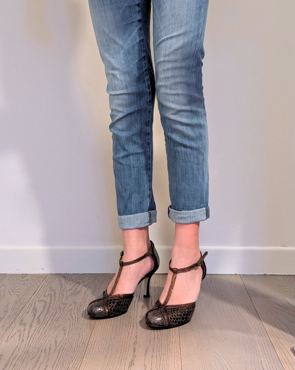 Décolleté da donna con cinturino t-bar e tacco di media altezza, Bianca è realizzata artigianalmente a mano a Porto Sant’Elpidio (Fermo-Marche) in pitone moro, cinturino in pelle laminata bronzo effetto craquelé (o crackle) e profilo sottile in laminato testa di moro.