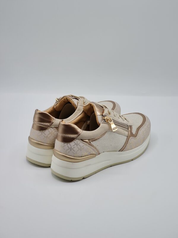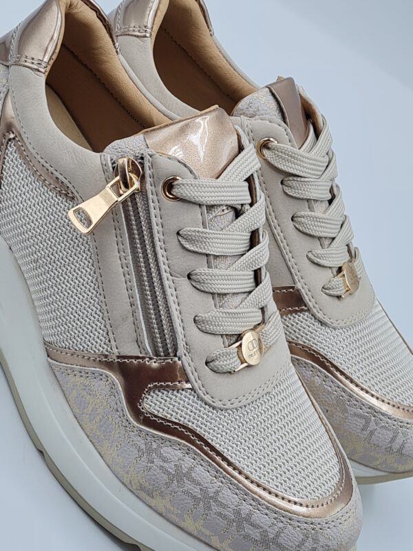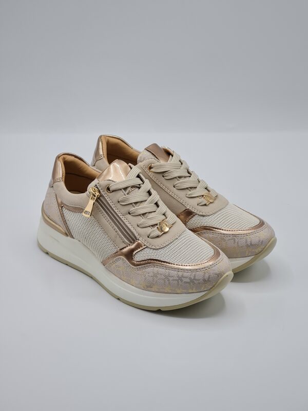 Sneaker beige con inserti ramati e tomaia in tessuto beige stampata in oro, dal look raffinato e contemporaneo. Chiusura con lacci e zip laterale per una calzata pratica e veloce. Sottopiede in memory rivestito in pelle per un comfort ottimale e suola in gomma , ideale per lโuso quotidiano.