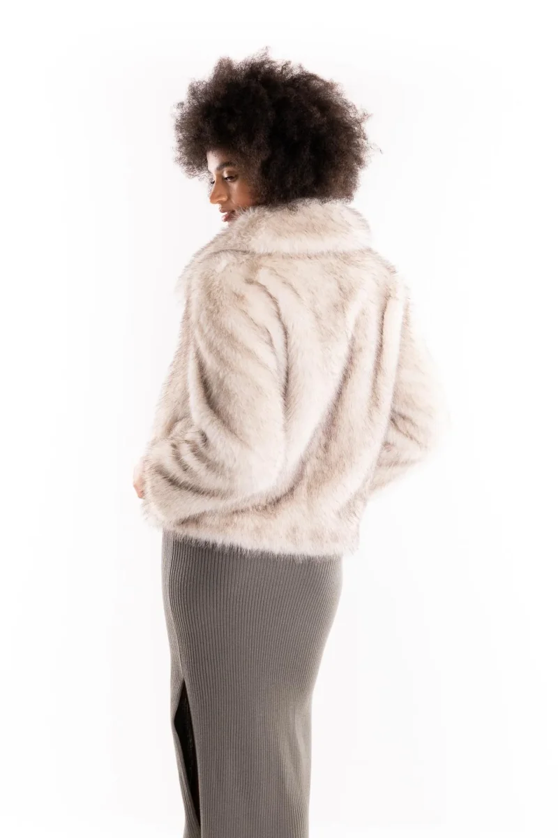 Giacca in tessuto furry color grigio con fodera interna. Fit ampio. Scollo con rever. Maniche raglan e chiusura con bottoni automatici invisibili. Tasche pellicceria. Composizione 100% poliestere. La modella รจ alta 1.79 e indossa una S