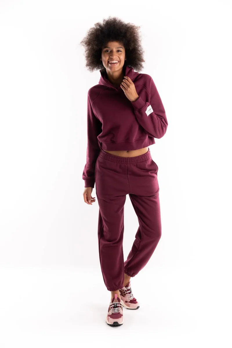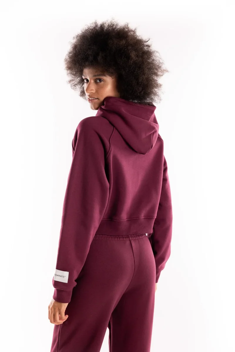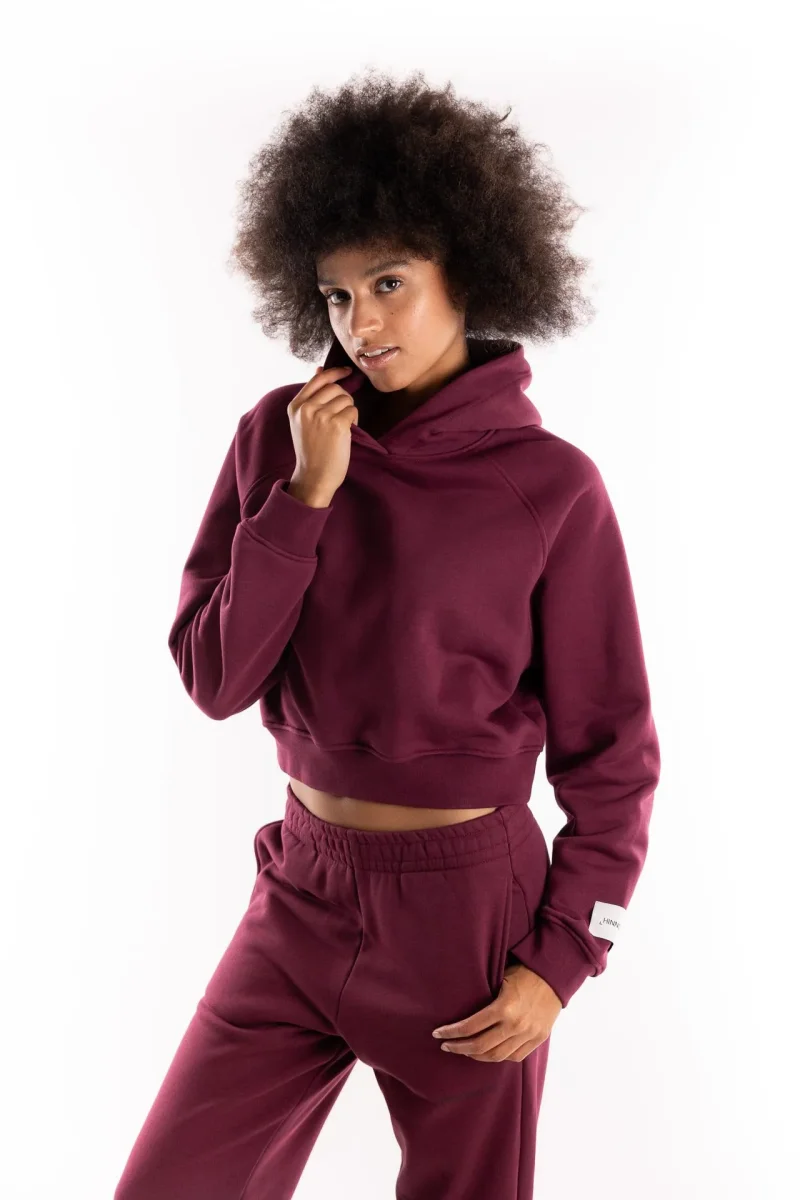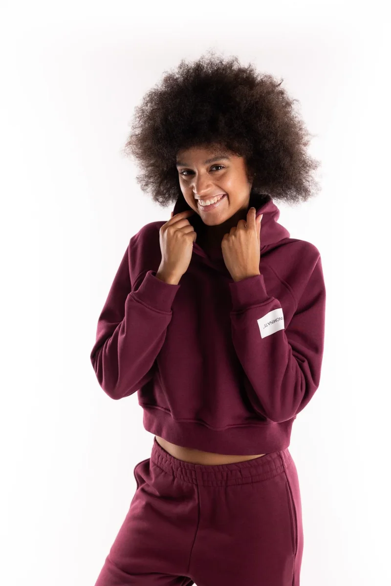 Felpa crop con cappuccio in cotone color bordeaux. Logo stampato. Vestibilitร  crop con manica raglan. Coposizione 90% cotone 10% poliestere. La modella รจ alta 1.75 e indossa una XS