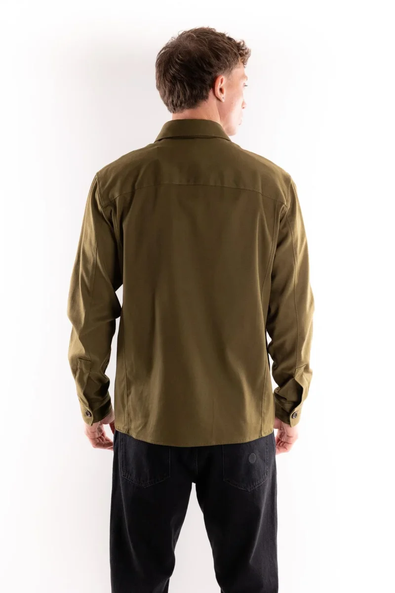 Giacca camicia realizzata in tessuto color verde marcio.Tasche applicate frontali con patta e bottoni. Colletto a camicia. Chiusura con bottoni. Vestibilitร  morbida. Interno sfoderato. Tasche a filo. Composizione 64% lyocell 34% cotone 2% elastan. Altezza modello 1,80 indossa una L