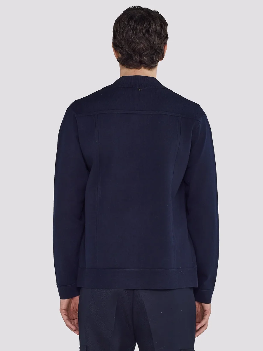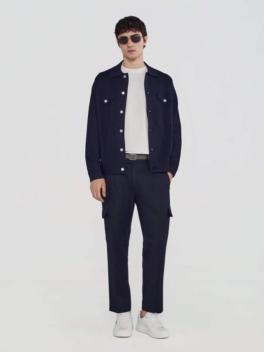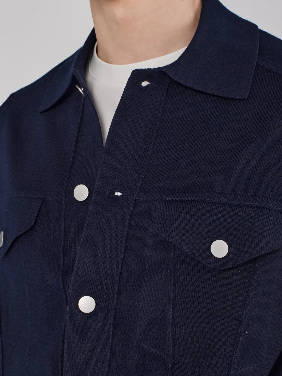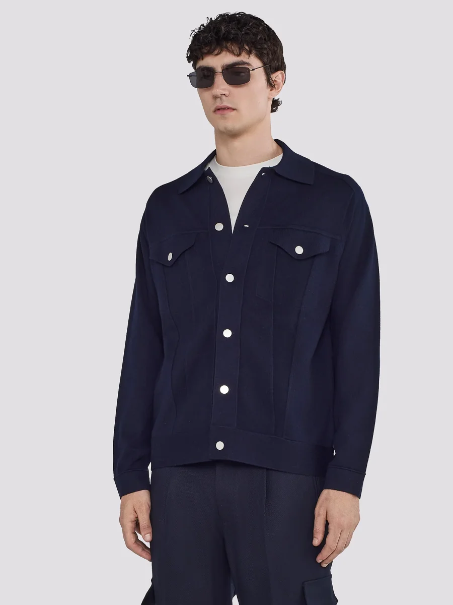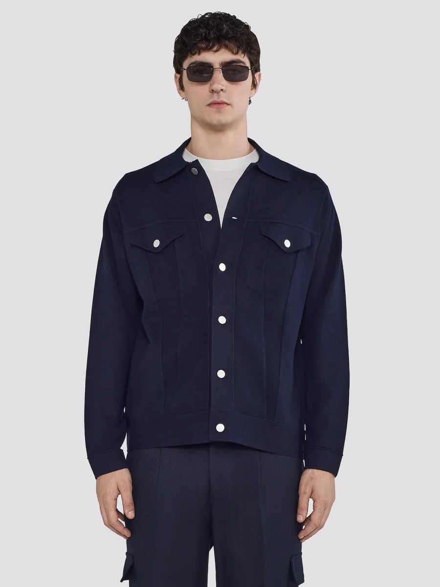 GIACCA IN MAGLIA COLLETTO CLASSICO CHIUSURA CON BOTTONI A PRESSIONE TASCHE APPLICATE CON PATTA E BOTTONE FONDO DRITTO VESTIBILIร REGOLARE
