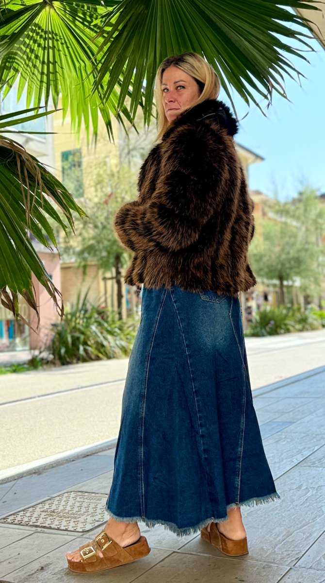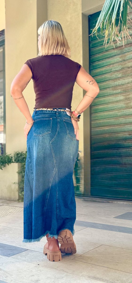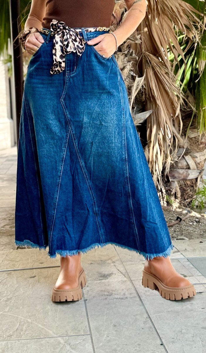 Un classico intramontabile rivisitato in chiave contemporanea: la gonna lunga di jeans svasata con frange sul fondo รจ il capo must-have che unisce comoditร , stile e carattere. Realizzata in denim resistente e di qualitร , si distingue per la linea svasata che valorizza la silhouette e regala un tocco di movimento ad ogni passo.