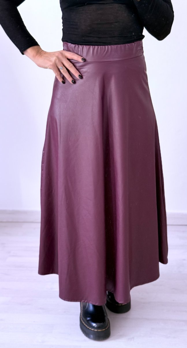Scopri l’essenza dello stile sofisticato con questa gonna midi a ruota in simil-pelle bordeaux, un capo iconico che unisce design classico e materiali moderni. Perfetta per chi ama distinguersi con un look audace e raffinato, questa gonna è il complemento ideale per outfit di tendenza, adatti a diverse occasioni.