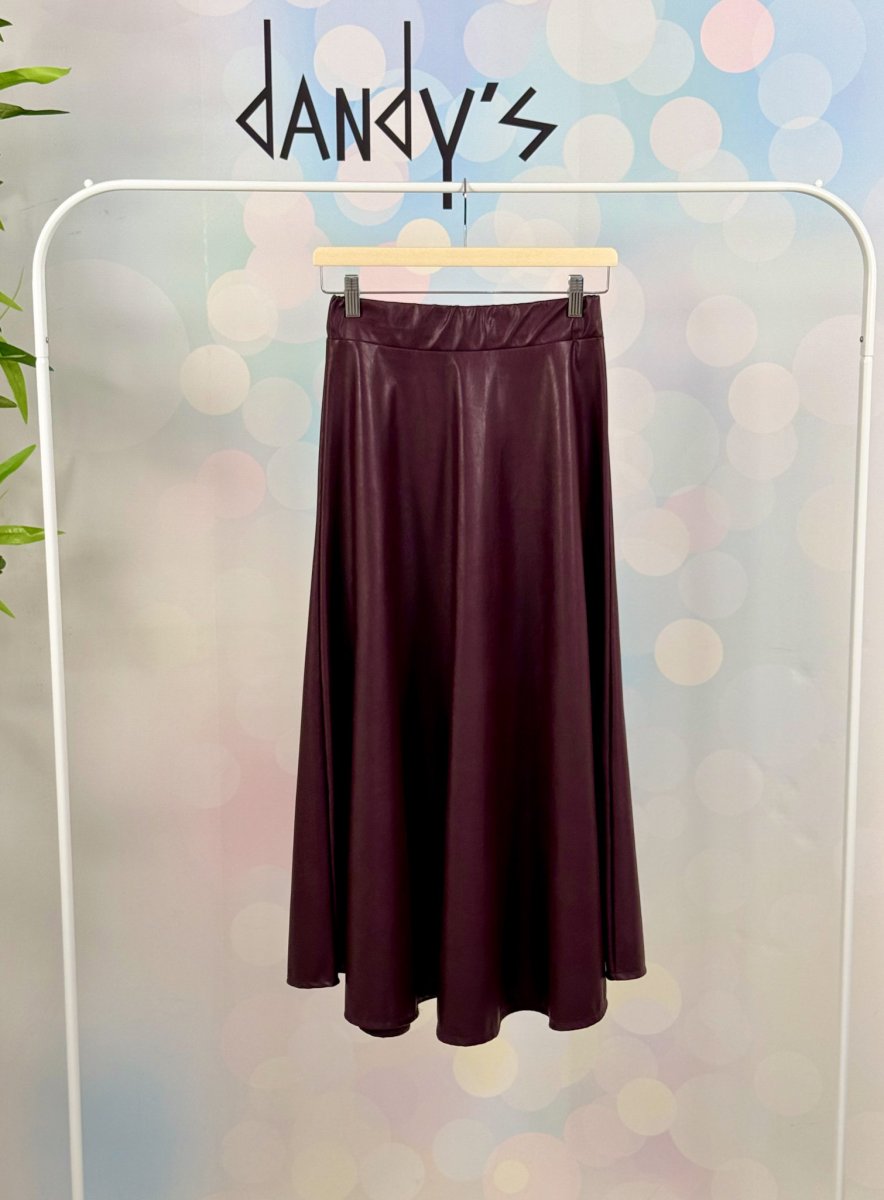 Gonna Midi a Ruota in Simil-Pelle Bordeaux – Eleganza Classica con un Tocco di ModernitÃ