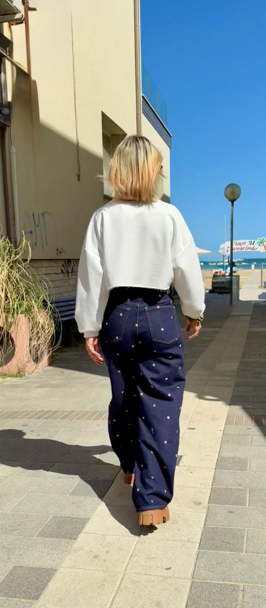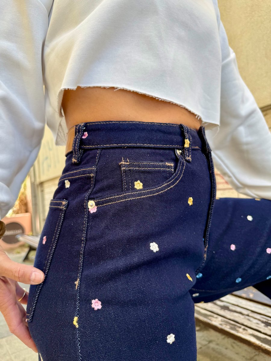 Il jeans baggy donna elasticizzato con fiorellini a vita alta รจ il perfetto equilibrio tra comfort e stile.