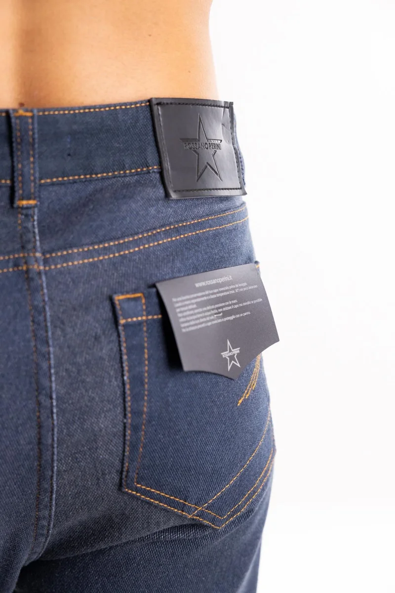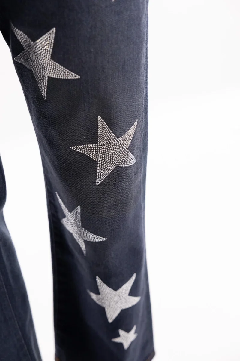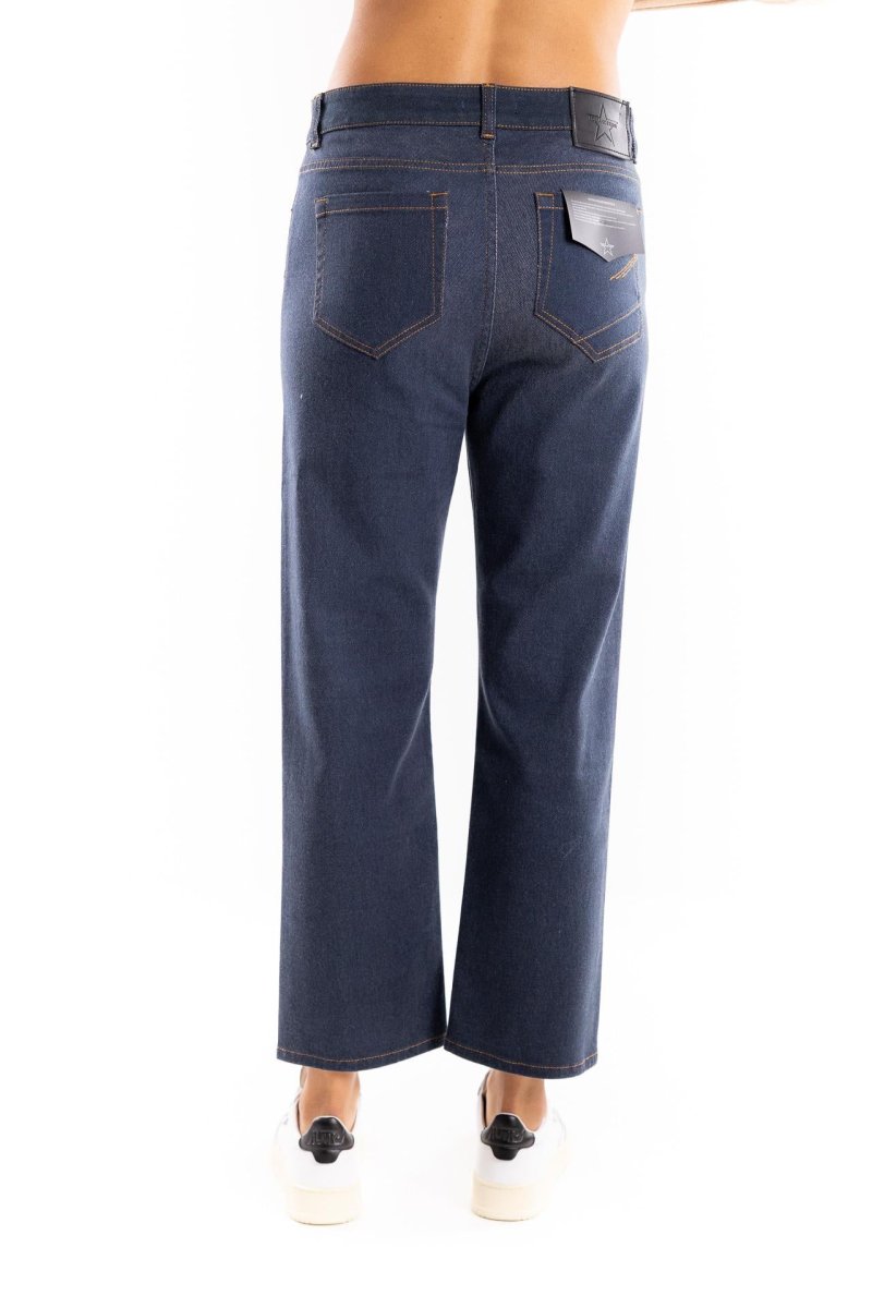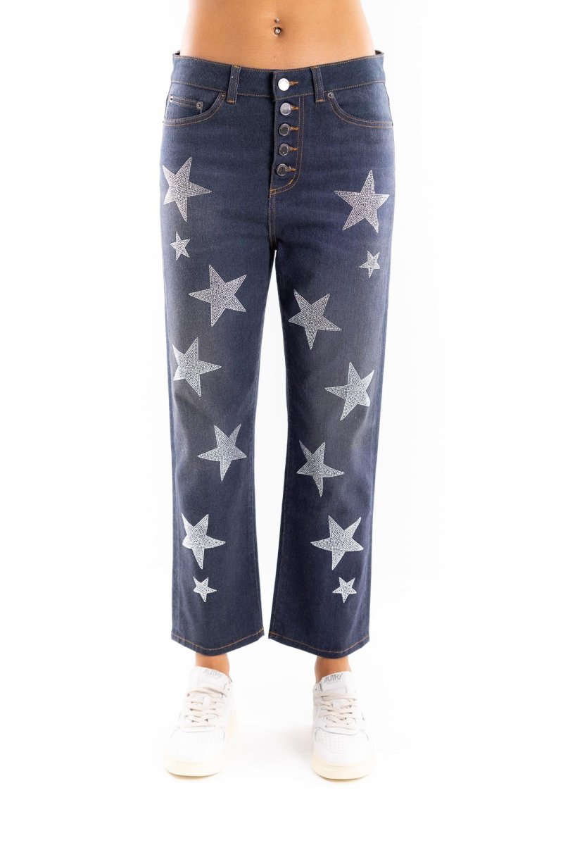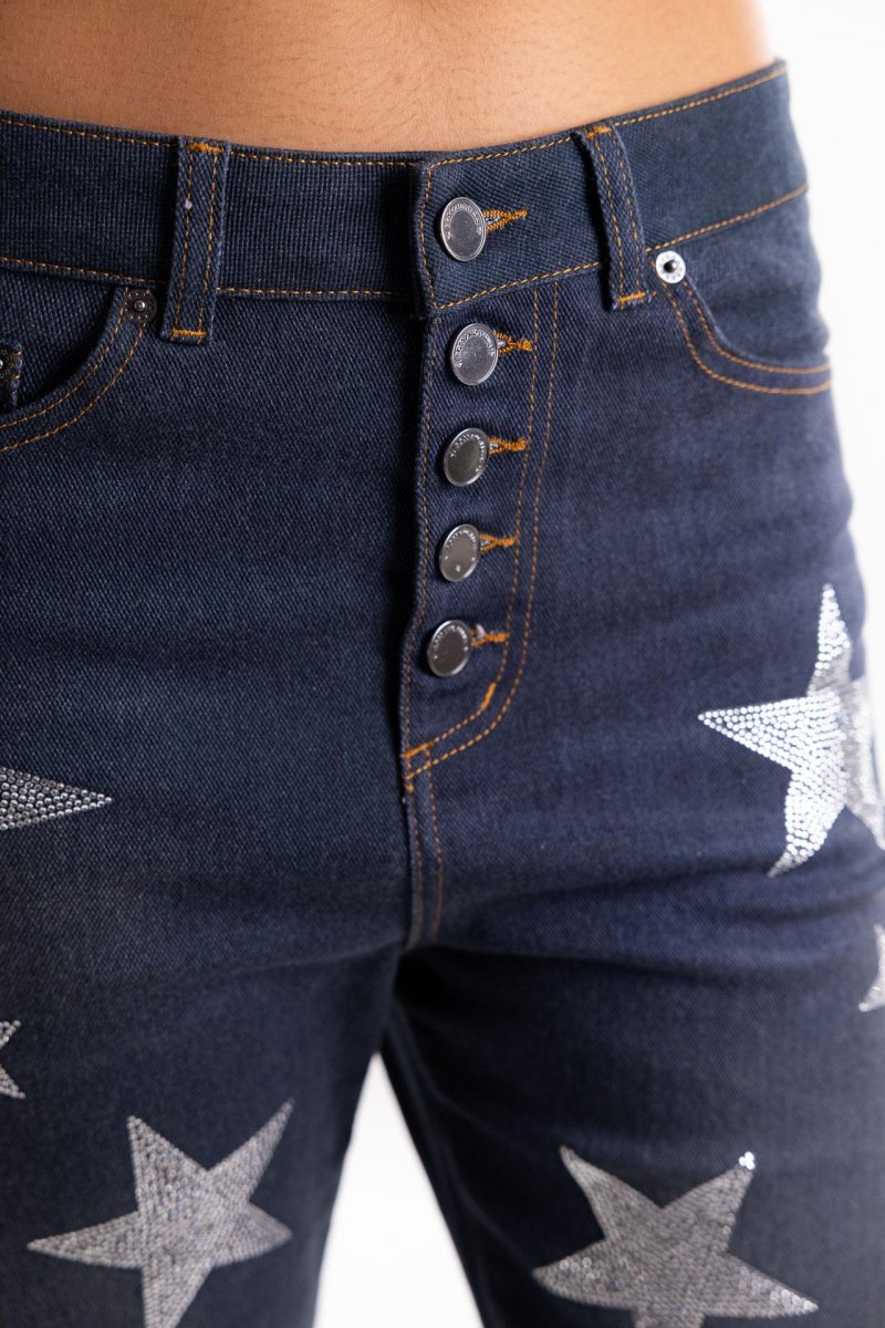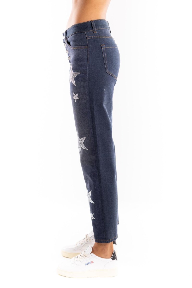 Jeans modello Loose 5 tasche in bull denim color blu scuro. Vestibilitร regolare con vita alta. Stelle con strass applicati di varie dimensioni color argento. Chiusura con bottoni logati. Realizzato in una meravigliosa tela 98% cotone 2% elastan. Hand made in italy. La modella รจ alta 1.78 e indossa una 27