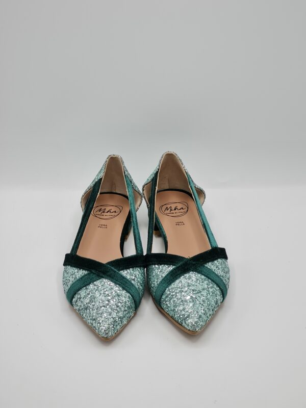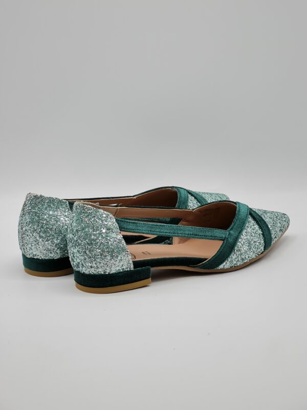 La scarpa รจ un’elegante ballerina caratterizzata da una silhouette sfiziosa e femminile. Il materiale esterno รจ costellato di glitter che conferiscono un tocco di brillantezza e glamour al velluto petrolio che avvolge la tomaia. La forma sfilata suggerisce un design che abbraccia delicatamente il piede, offrendo comfort e stile. Il tacco basso di soli 2 centimetri fornisce una leggera elevazione, ideale per chi cerca un po’ di rialzo senza compromettere la comoditร . Il fondo in gomma offre un ottimo grip e una stabilitร sicura, rendendo questa ballerina adatta sia per occasioni casual che piรน formali. Coniugando la lucentezza dei glitter,…