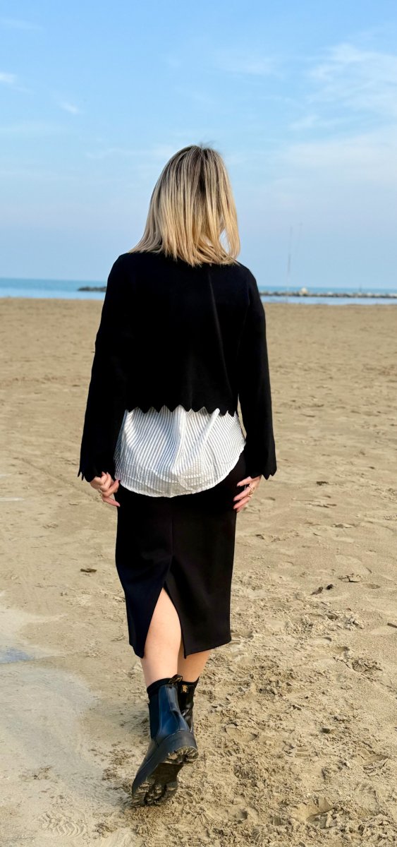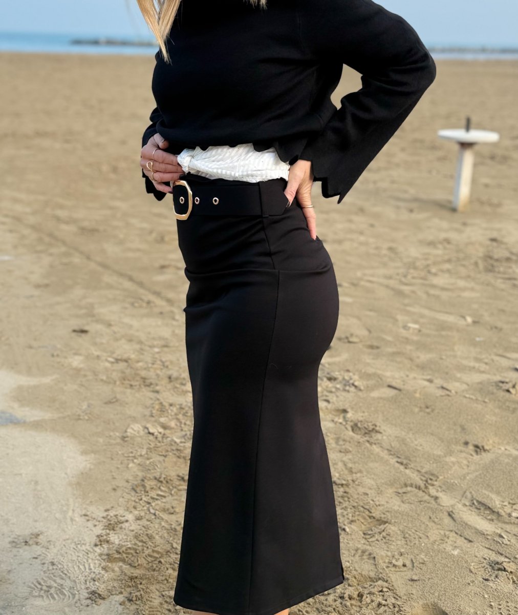 Il taglio midi rende il capo elegante e raffinato, mentre il delicato spacco posteriore aggiunge non solo un dettaglio sensuale e discreto, ma anche maggiore praticitร nella camminata. Un equilibrio perfetto tra stile e funzionalitร .