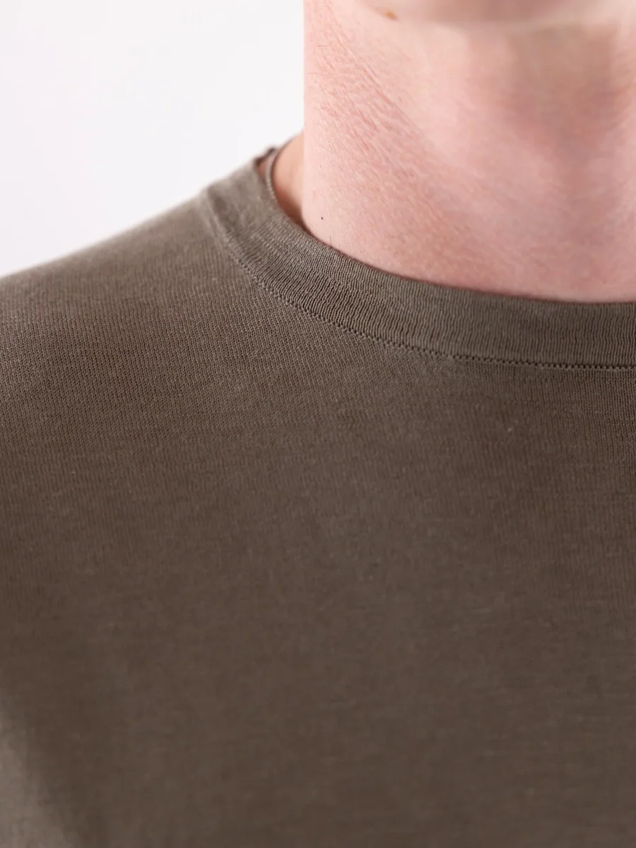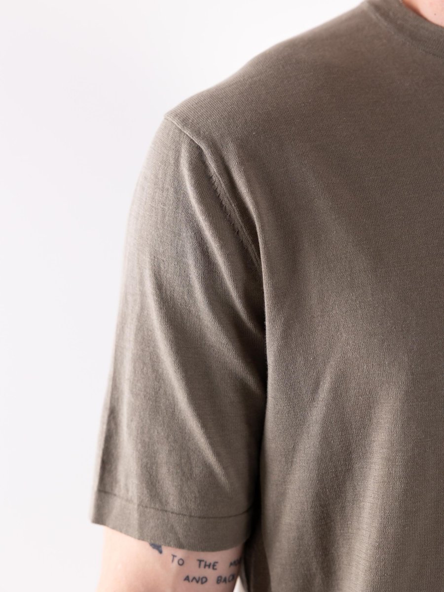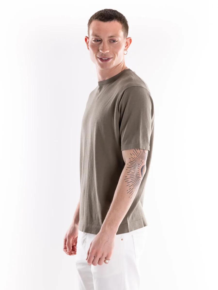 Maglia girocollo in filo realizzata in cotone tinta unita verde militare. Bordo a costine su fondo e maniche e collo. Manica corta. Dettaglio di tessuto con trama microforata sotto manica per garantire la traspirazione. Vestibilitร regolare. Composizione 85% cotone 10% seta 5% lino. Altezza modello 1,80 indossa una 50