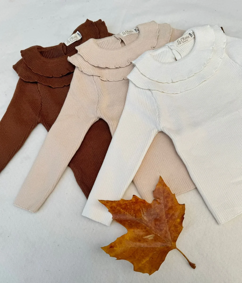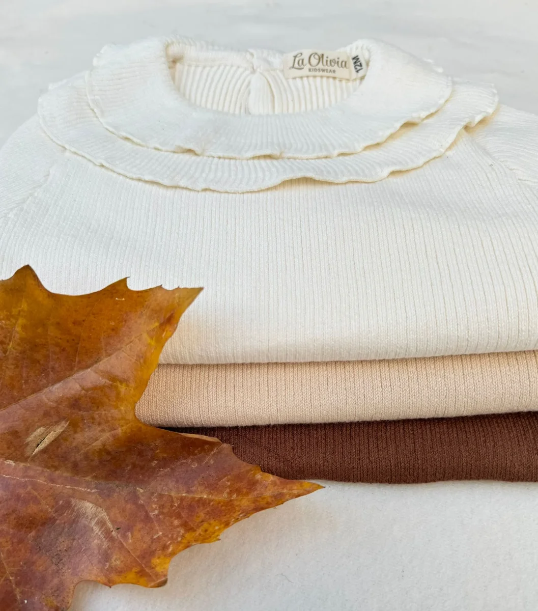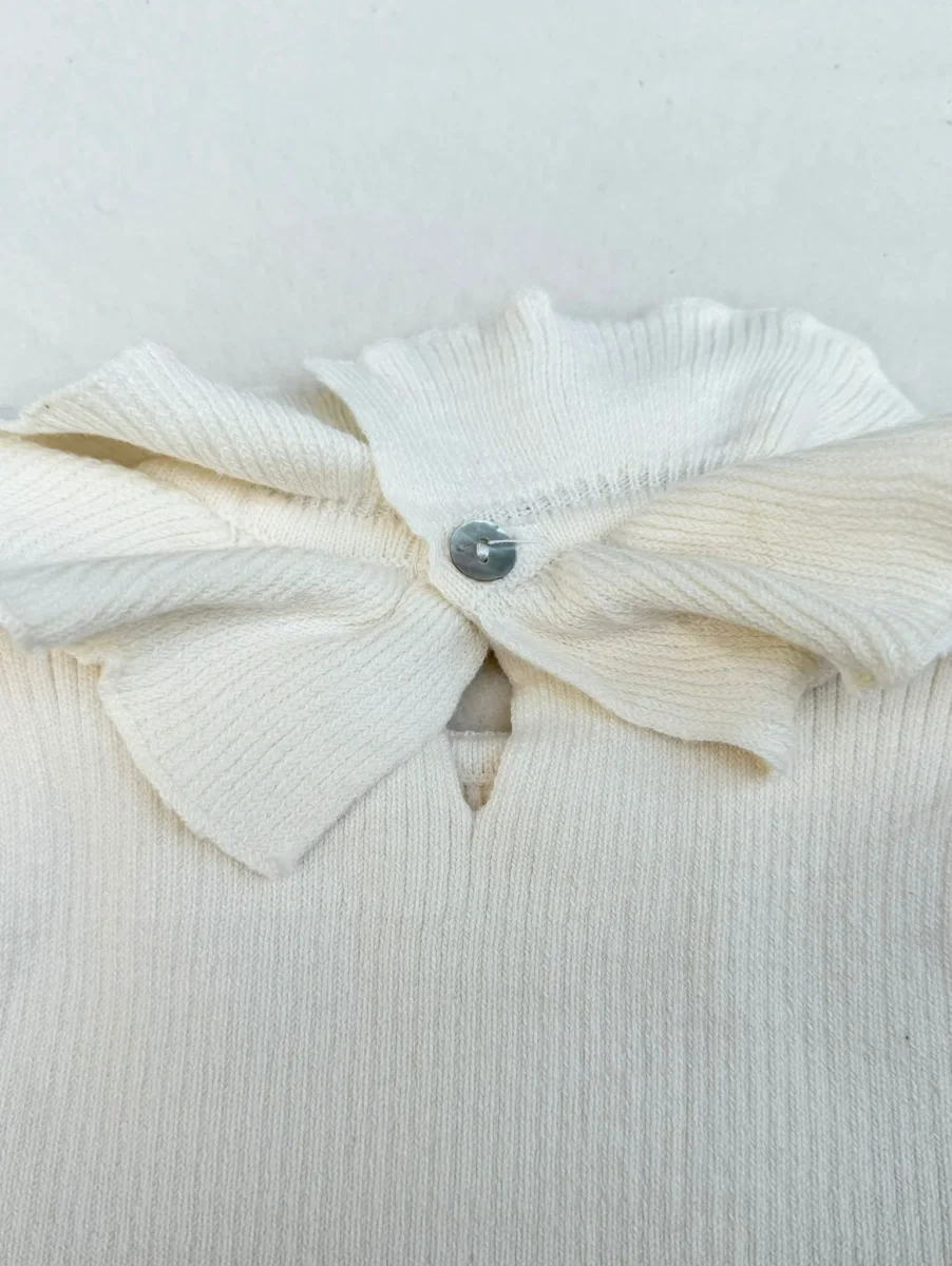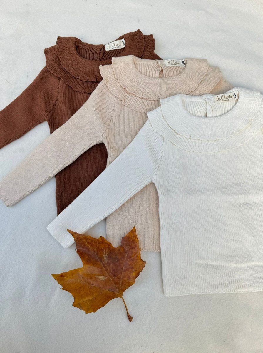 Graziosa maglia a costine con una delicata scollatura a doppia increspatura. Disponibile in tre colori caldi : panna, marrone e beige. ร una maglia molto carina da indossare a strati o da sola.