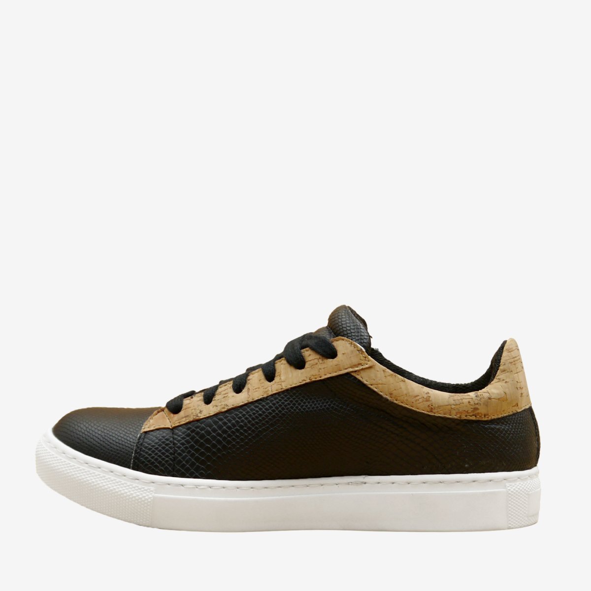Una sneakers nera con dettagli in sughero, totalmente naturale e assolutamente stilosa. Il tomaio in pelle mela, con stampa pitone, la rende morbida e traspirante, ideale anche per la primavera e per chi non rinuncia al tocco di nero nel proprio look. Fodera interna in eucalipto e cotone biologico, per una massima traspirabilitร e per ottenere un effetto antibatterico perfetto per le calzature sportive.ย Suola a cassetta in gomma morbida. All’interno un soletto di montaggio trattato con clorofilla ed un soletto estraibile in lattice vegetale, canapa e lino, con dettaglio in sughero (taglie uomo), oppure soletto fisso in sughero (taglie donna).…