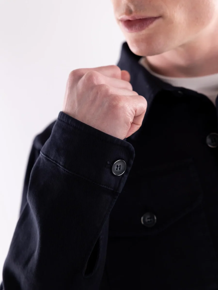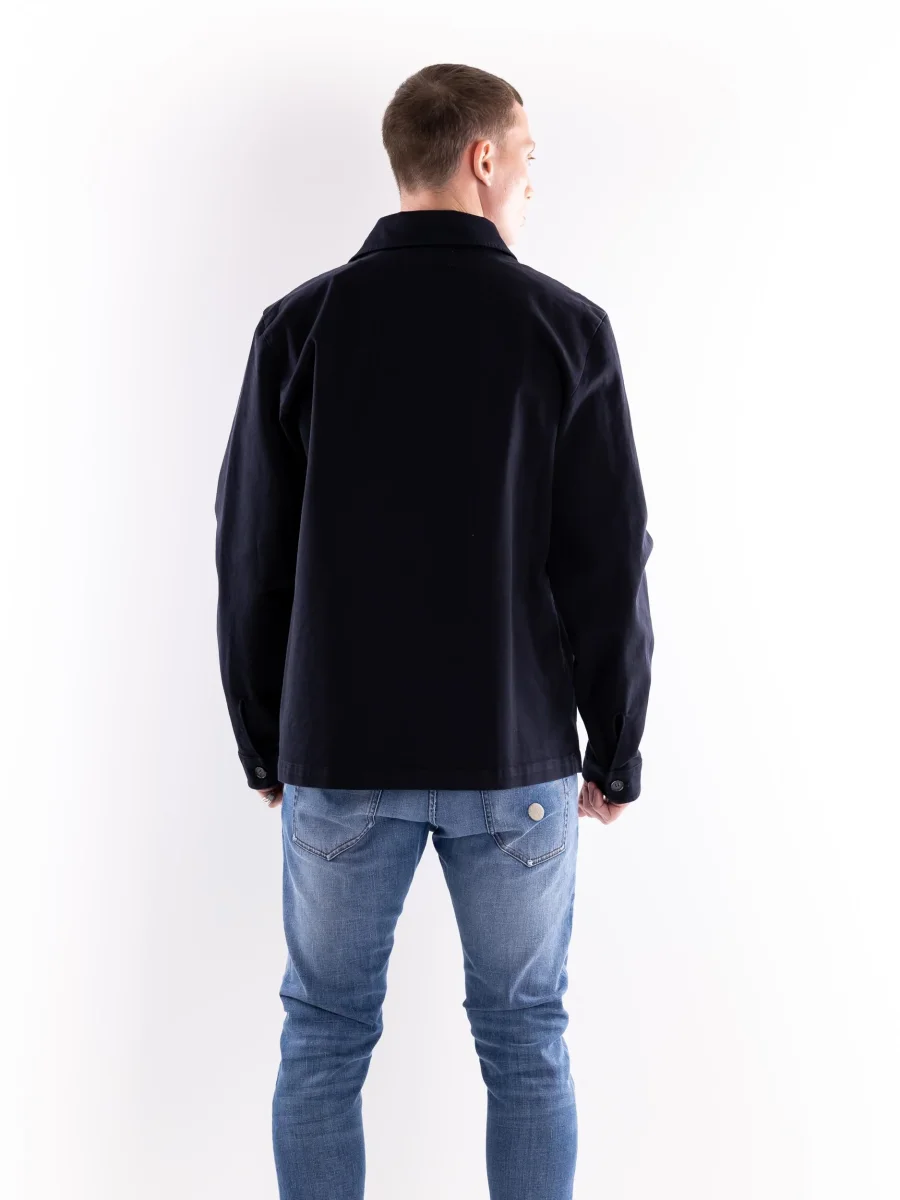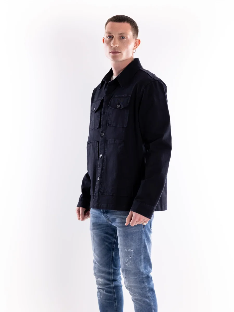 Giacca camicia realizzata in tessuto color blu. Tasche applicate frontali con patta e bottoni. Colletto a camicia. Chiusura con bottoni. Vestibilitร morbida. Interno sfoderato. Manica lunga con polsini e bottoni nel finale. Composizione 98% cotone 2% elastan. Altezza modello 1,80 indossa una M