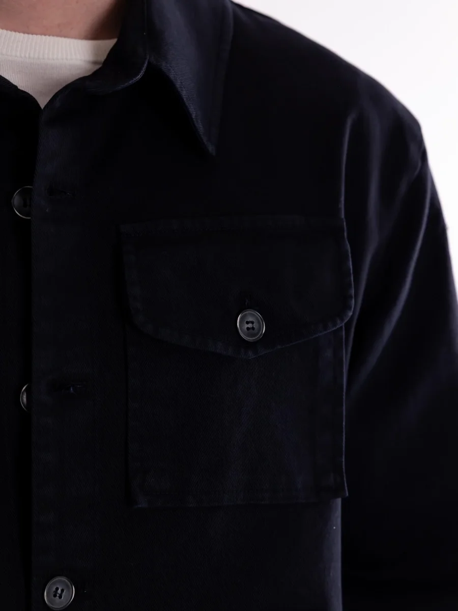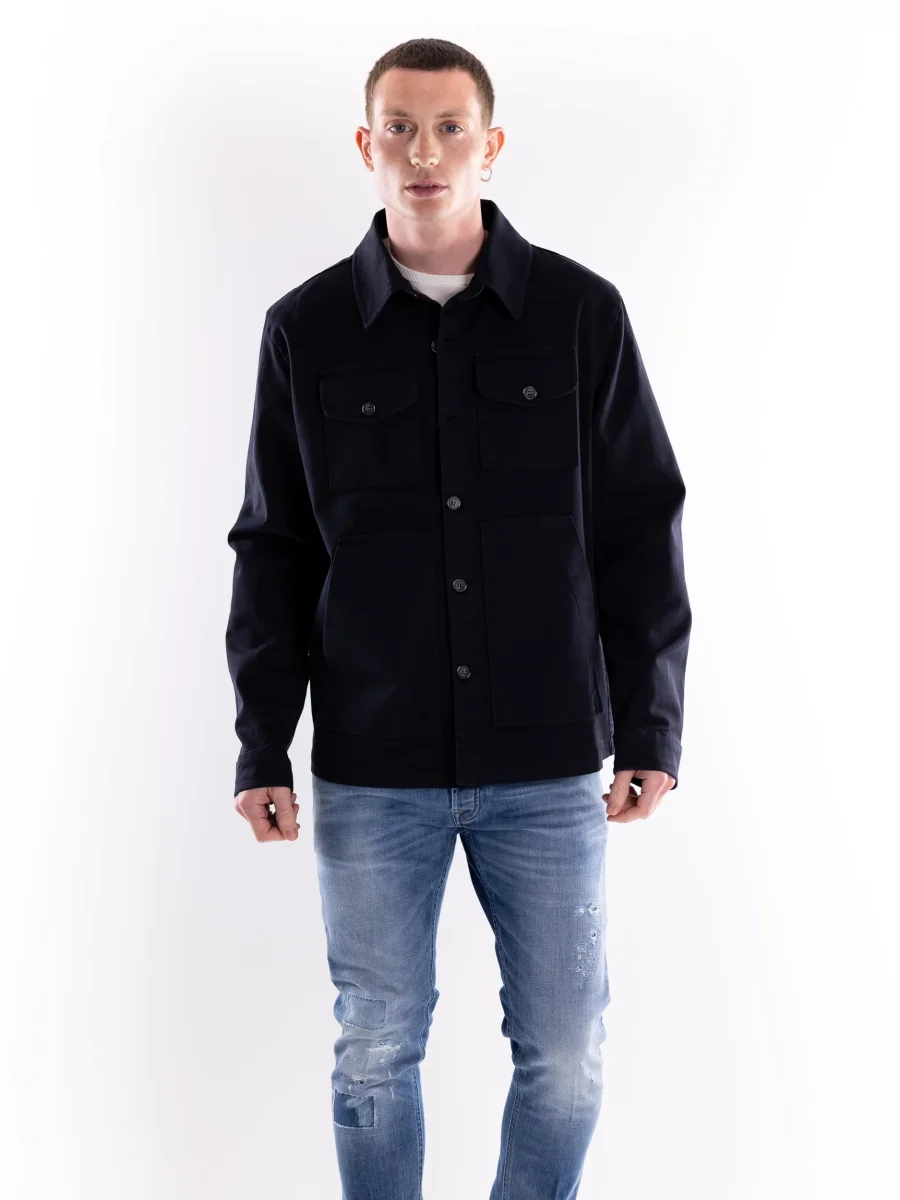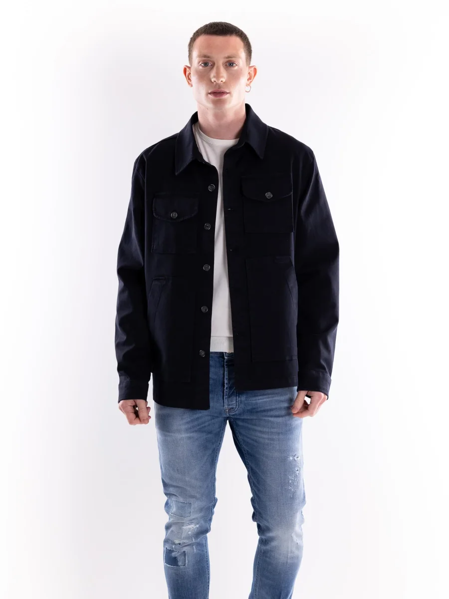 Giacca camicia realizzata in tessuto color blu. Tasche applicate frontali con patta e bottoni. Colletto a camicia. Chiusura con bottoni. Vestibilitร morbida. Interno sfoderato. Manica lunga con polsini e bottoni nel finale. Composizione 98% cotone 2% elastan. Altezza modello 1,80 indossa una M