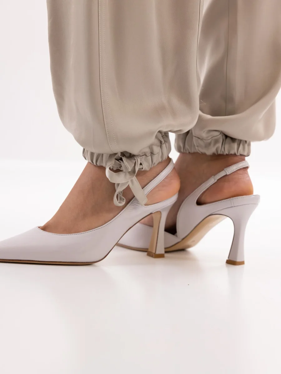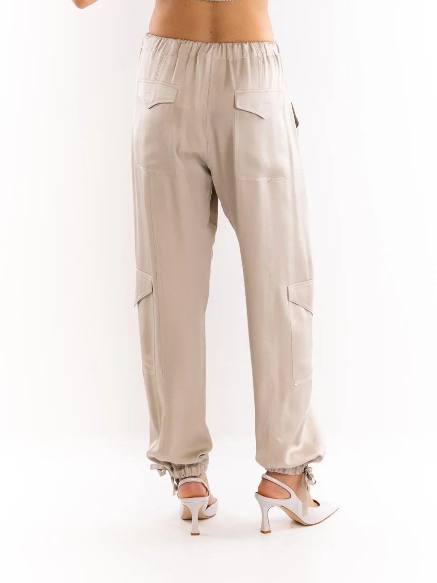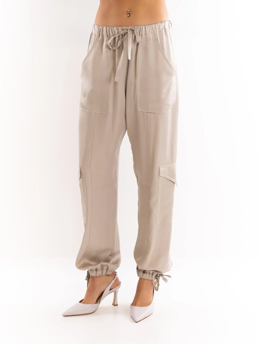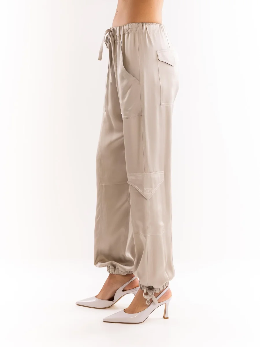 Pantalone cargo in tessuto semilucido taupe. Elastico e coulisse in vita. Tasche posteriori applicate con patta. Tasconi applicati. Vestibilitร morbida. Fondo largo con elastico e laccio per stringerlo. Composizione 40% cotone 10% fibra metalizzata 46% viscosa 5% poliamide. Made in italy. Altezza modella 1,75 indossa una 40