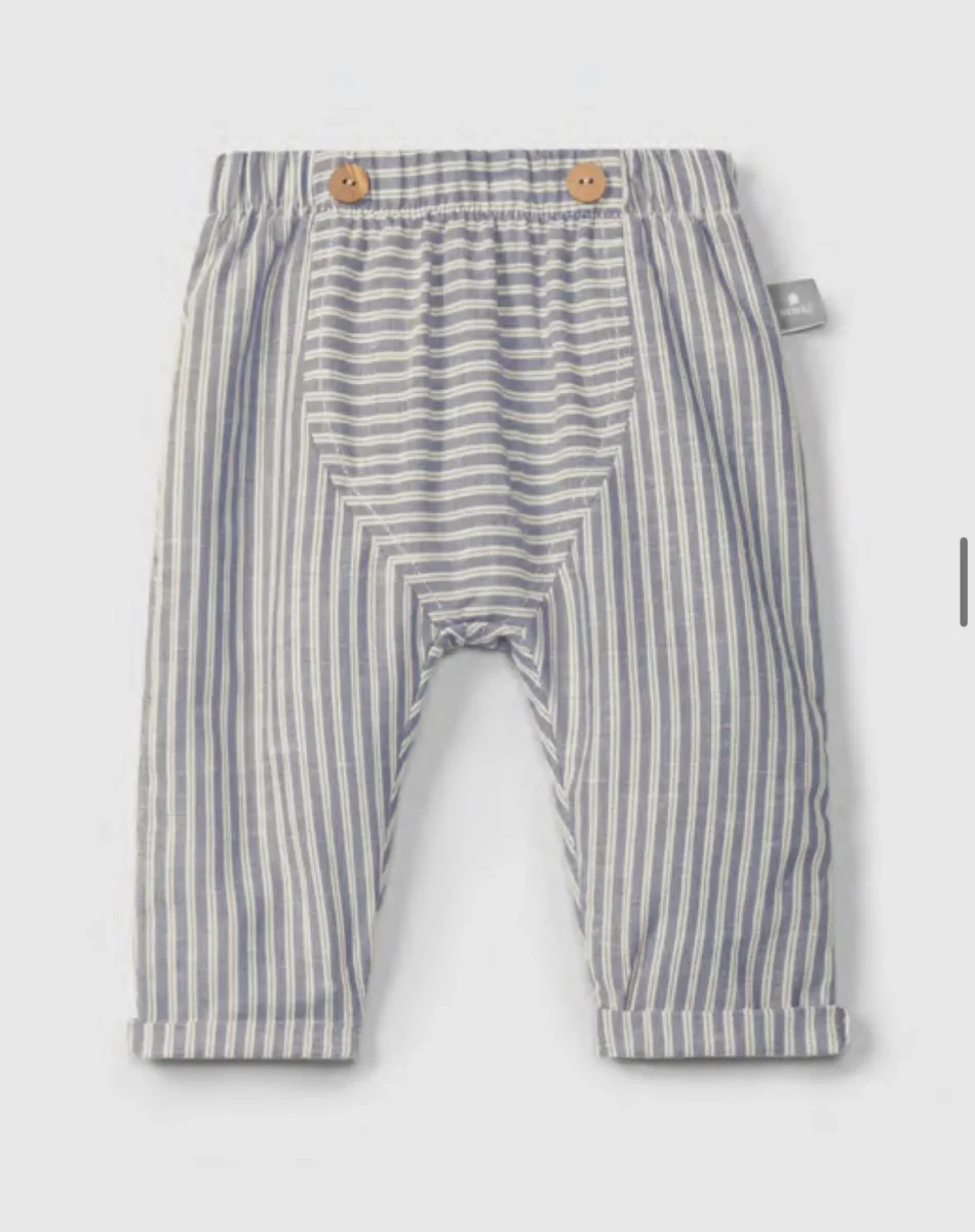 Pantaloni pull-up realizzati in cotone biologico rigato con un tocco di lino, perfetti per i bambini che amano muoversi liberamente. Caratterizzati da bottoni decorativi in legno in vita, offrono uno stile naturale e sostenibile. I polsini versatili possono essere indossati arrotolati o distesi, garantendo una vestibilitร comoda e una maggiore durata nel tempo. Un capo pratico e consapevole per il guardaroba dei piรน piccoli.
