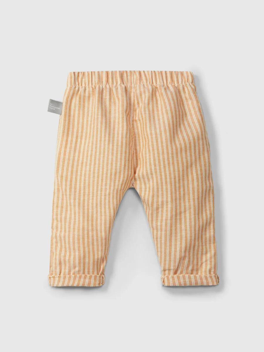 Pantaloni pull-up realizzati in cotone biologico rigato con un tocco di lino, perfetti per i bambini che amano muoversi liberamente. Caratterizzati da bottoni decorativi in legno in vita, offrono uno stile naturale e sostenibile. I polsini versatili possono essere indossati arrotolati o distesi, garantendo una vestibilitร comoda e una maggiore durata nel tempo. Un capo pratico e consapevole per il guardaroba dei piรน piccoli.