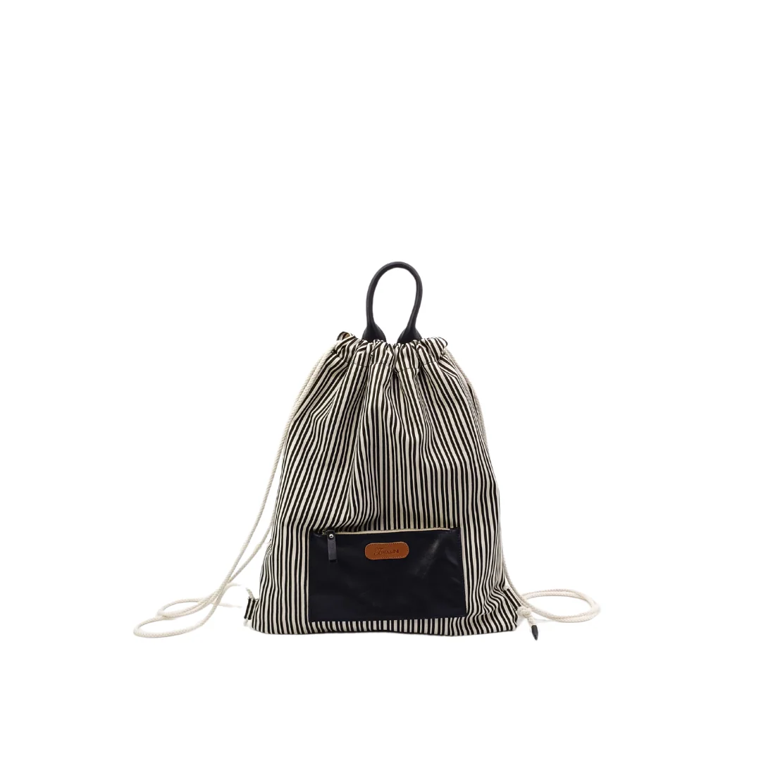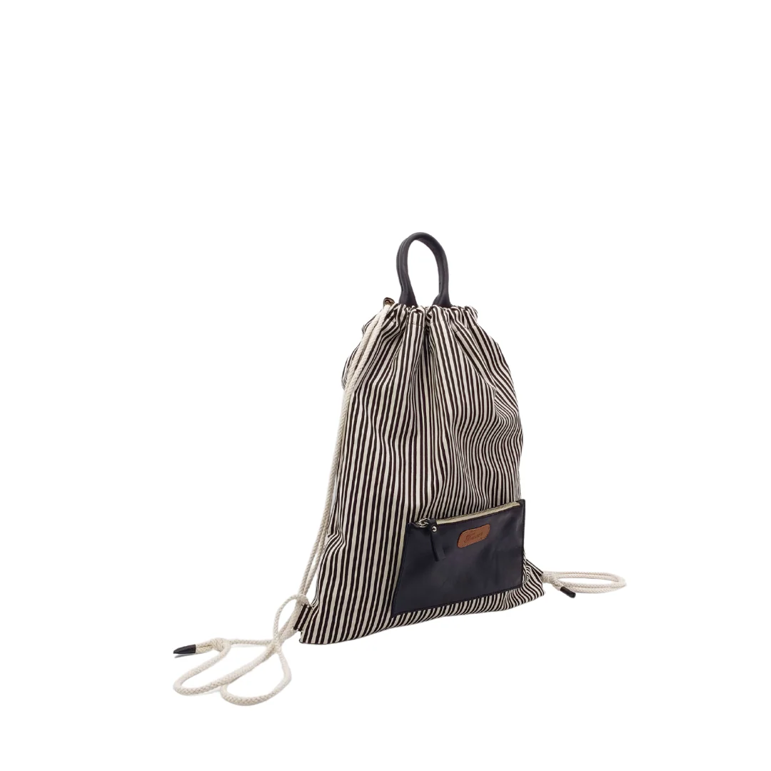 Realizzata in canvas di cotone rigato con tasche e chiusura pratica con lacci a coulisse.